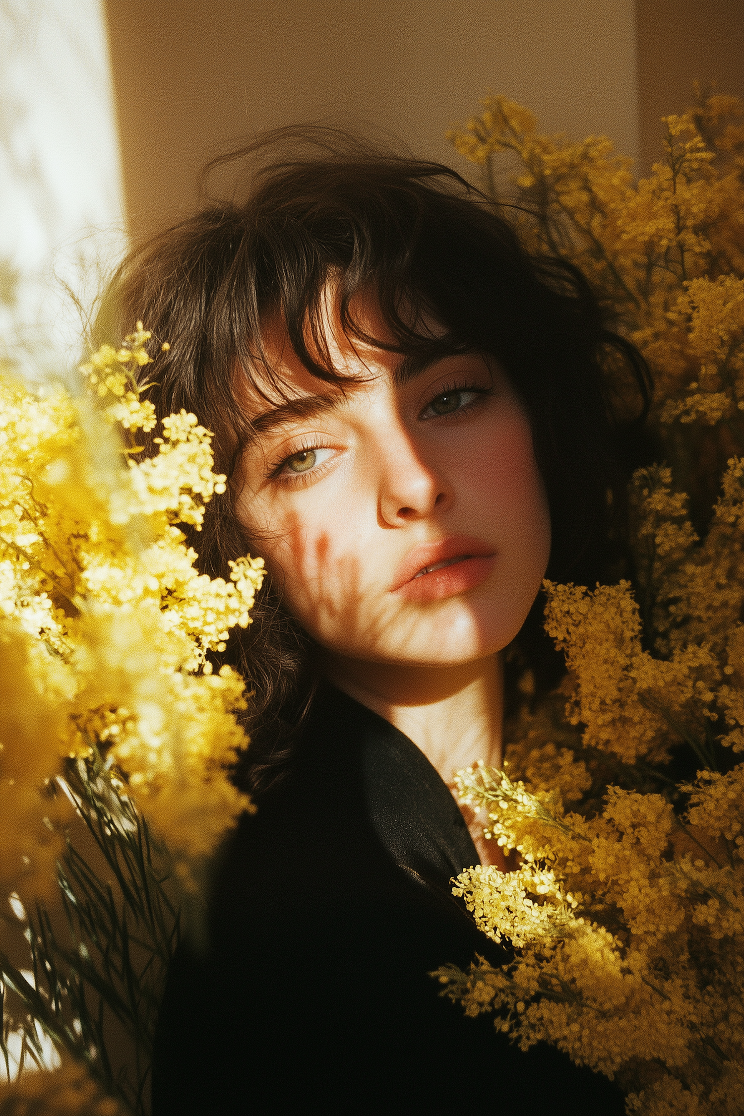 A serene portrait of a woman with green eyes and dark hair surrounded by vibrant yellow mimosa flowers in warm sunlight.