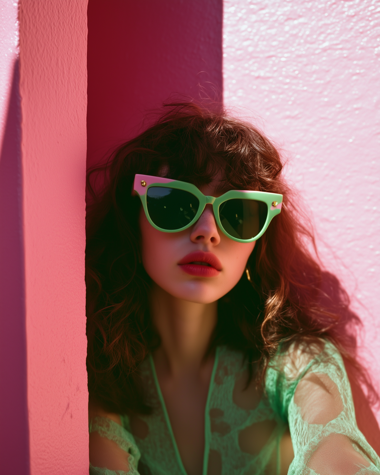 Stylish woman with green sunglasses and red lips against a pink wall, wearing a sheer green top. Fashionable and vibrant scene.