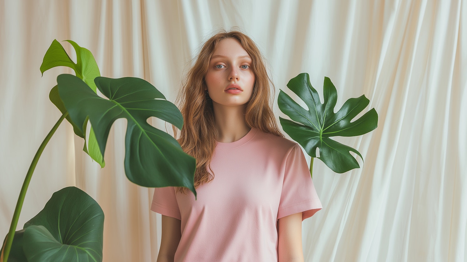 Young woman in pink t-shirt surrounded by lush green monstera leaves against a cream fabric backdrop.