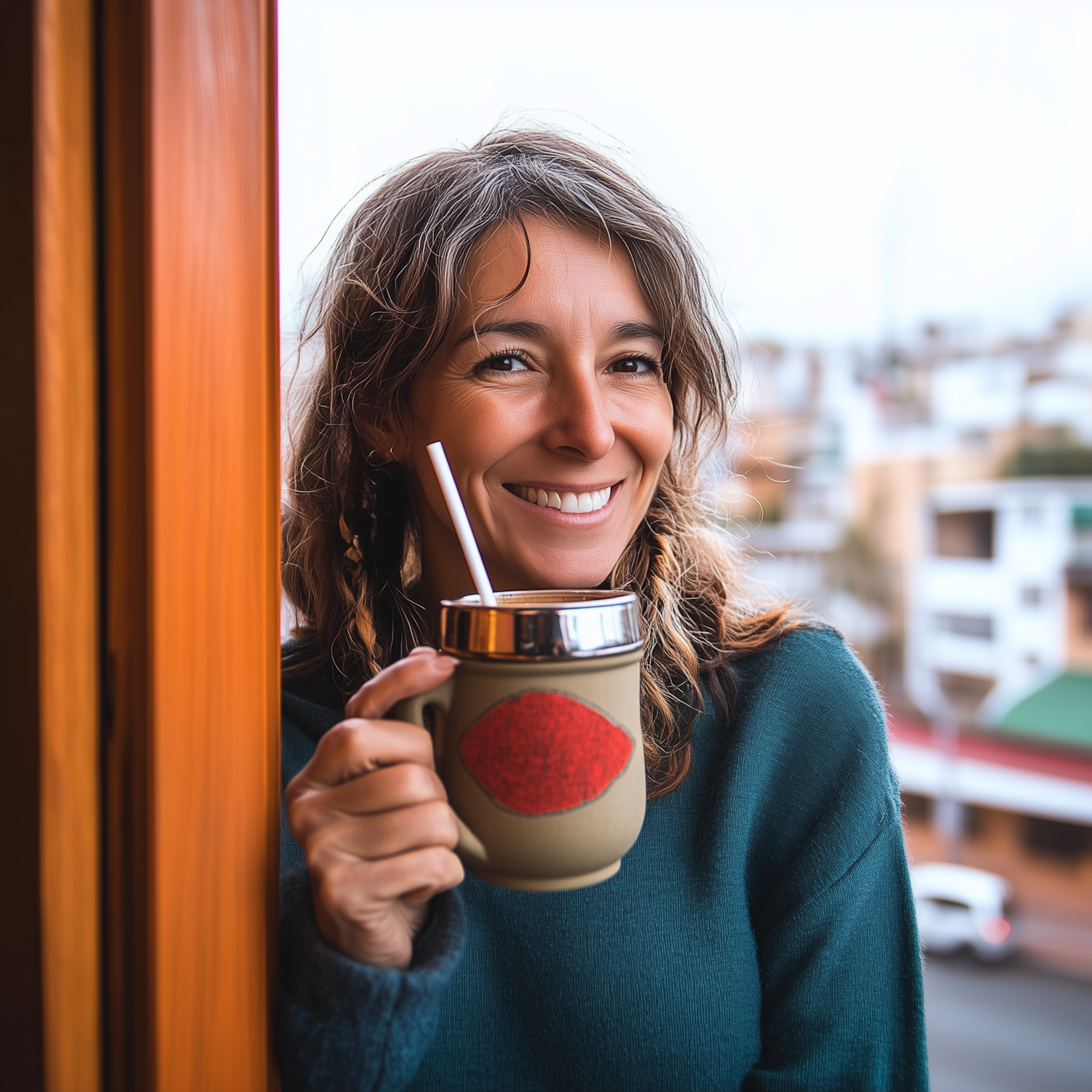 Smiling woman with wavy brown hair enjoys a drink from a stylish mug near a window, with a blurred urban backdrop adding charm.