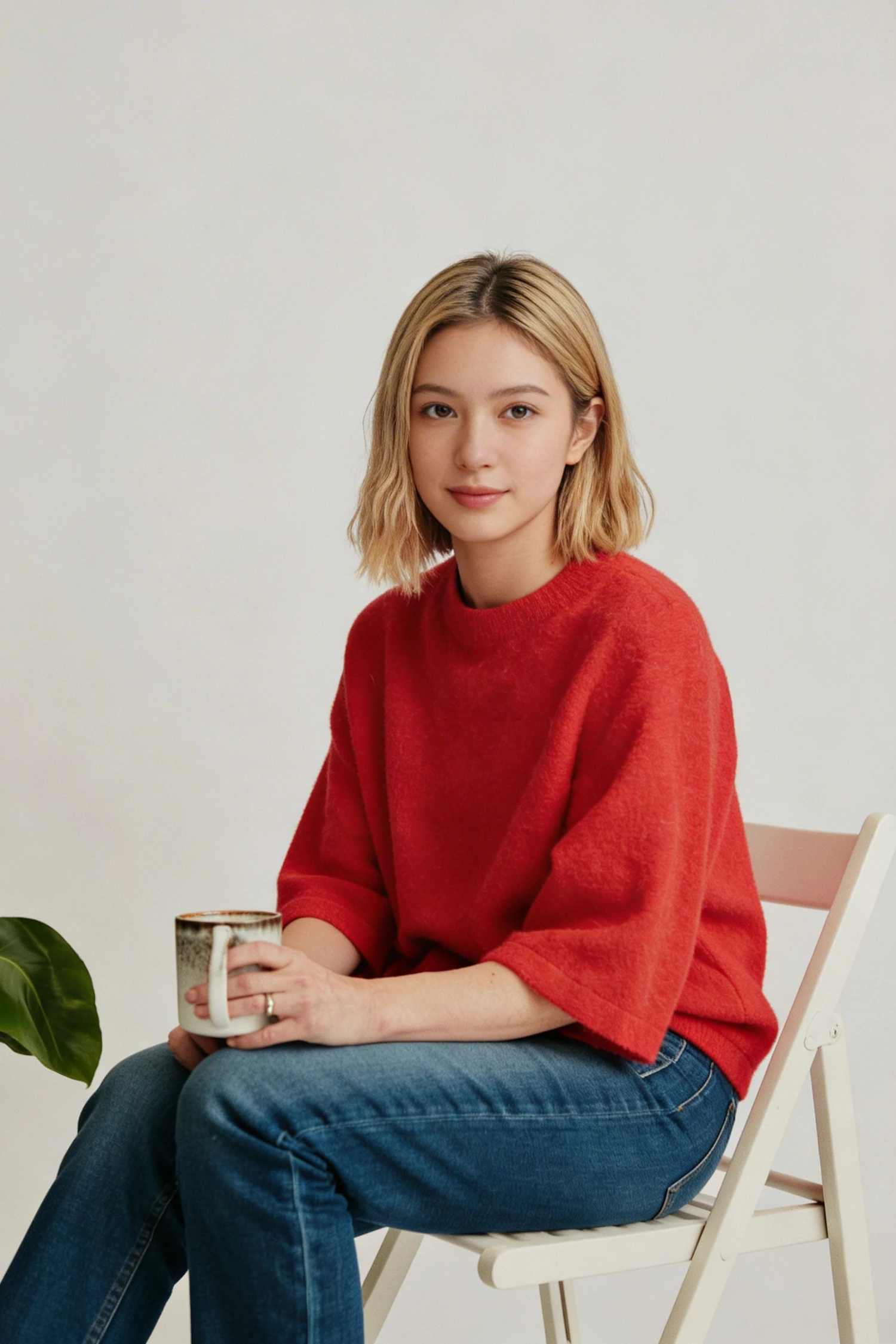 A young woman in a red sweater and jeans sits on a chair holding a mug, with a calm expression and a minimalistic background.