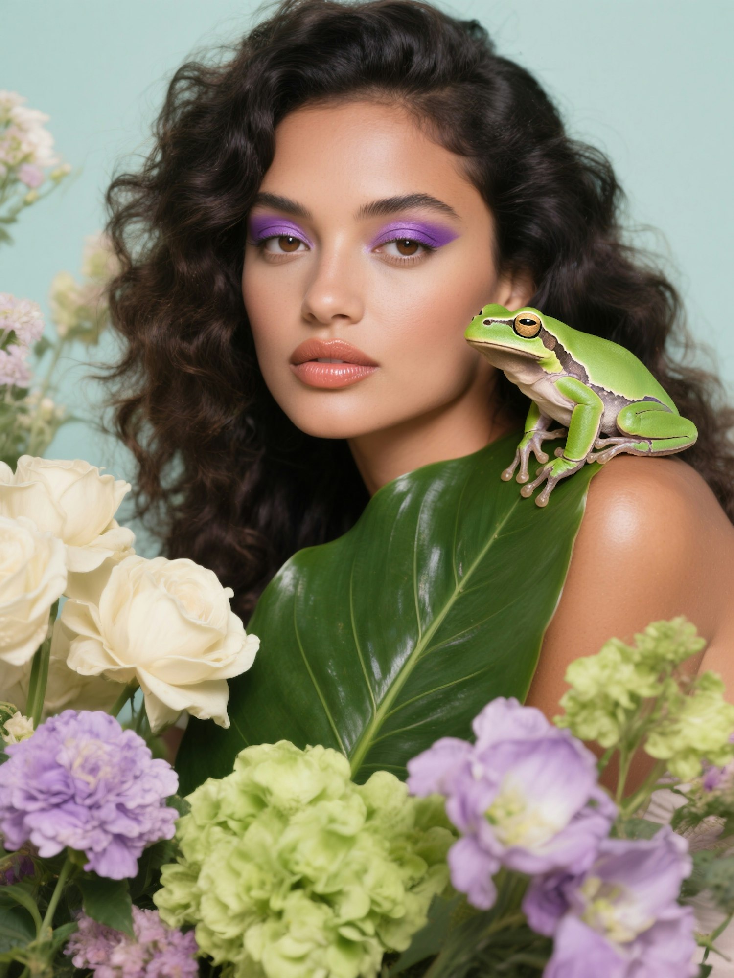high fashion editorial portrait of a woman, perfect glossy skin, warm soft lighting, rich floral composition, detailed textures, vibrant colors, high-end studio photography, cinematic ambiance, 85mm lens, a woman with olive-toned skin and voluminous dark curls, wearing lavender eyeshadow and glossy peach lips, a green tree frog sitting on a tropical leaf beside her face, flowers in cream, lilac and lime green tones, soft mint backdrop