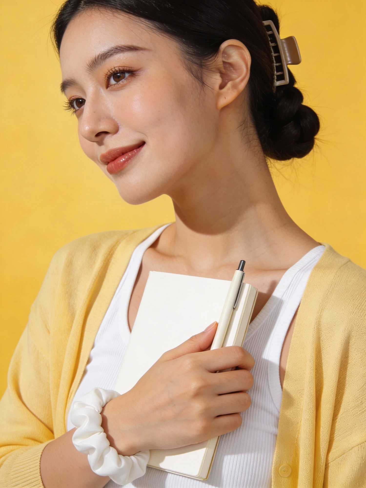 A woman in a yellow cardigan holding a notebook and pen, set against a bright yellow background, exuding a cheerful and warm vibe.