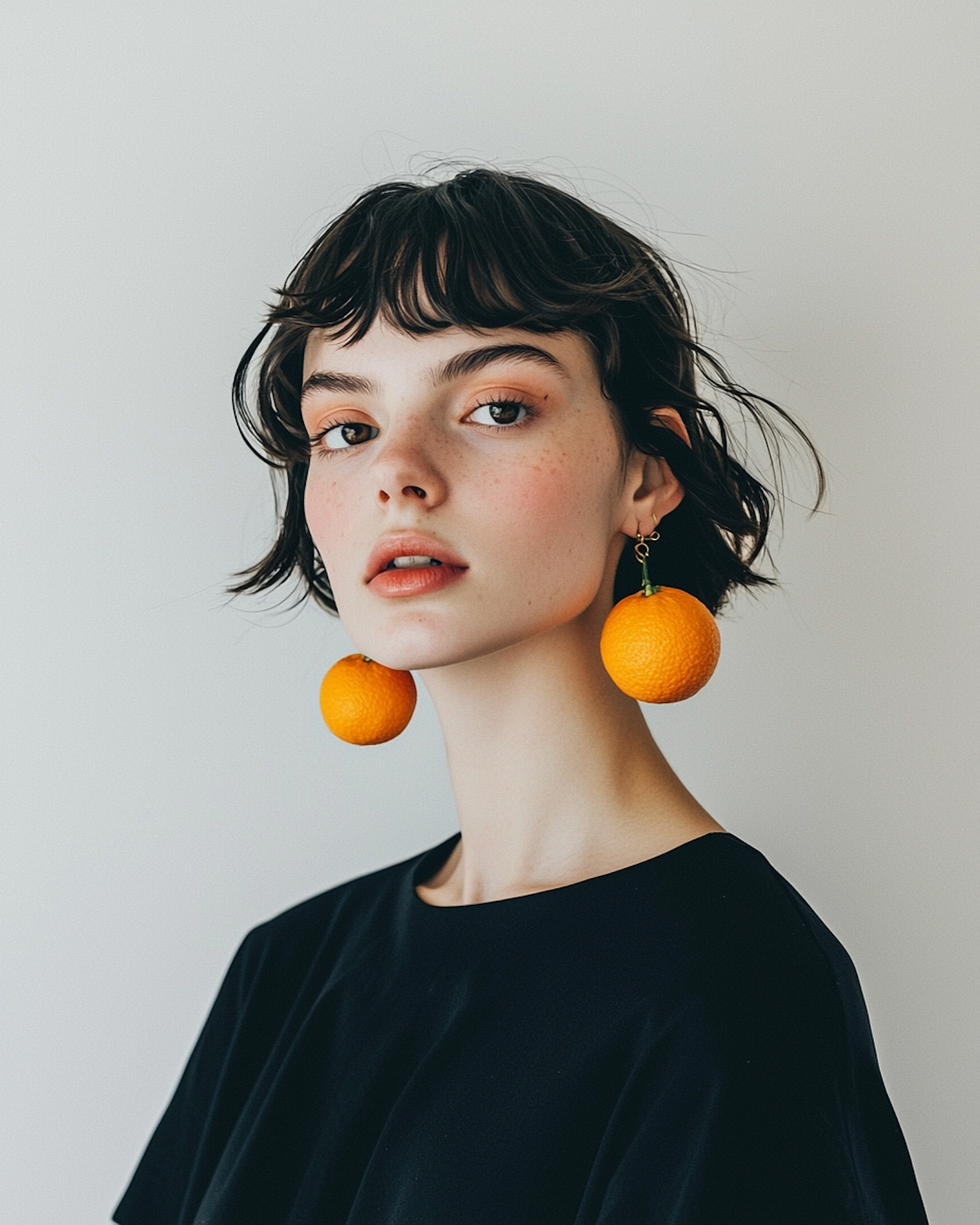 A stylish woman with orange earrings and a black top, blending minimalism with bold, artistic accessories in a clean, light background.