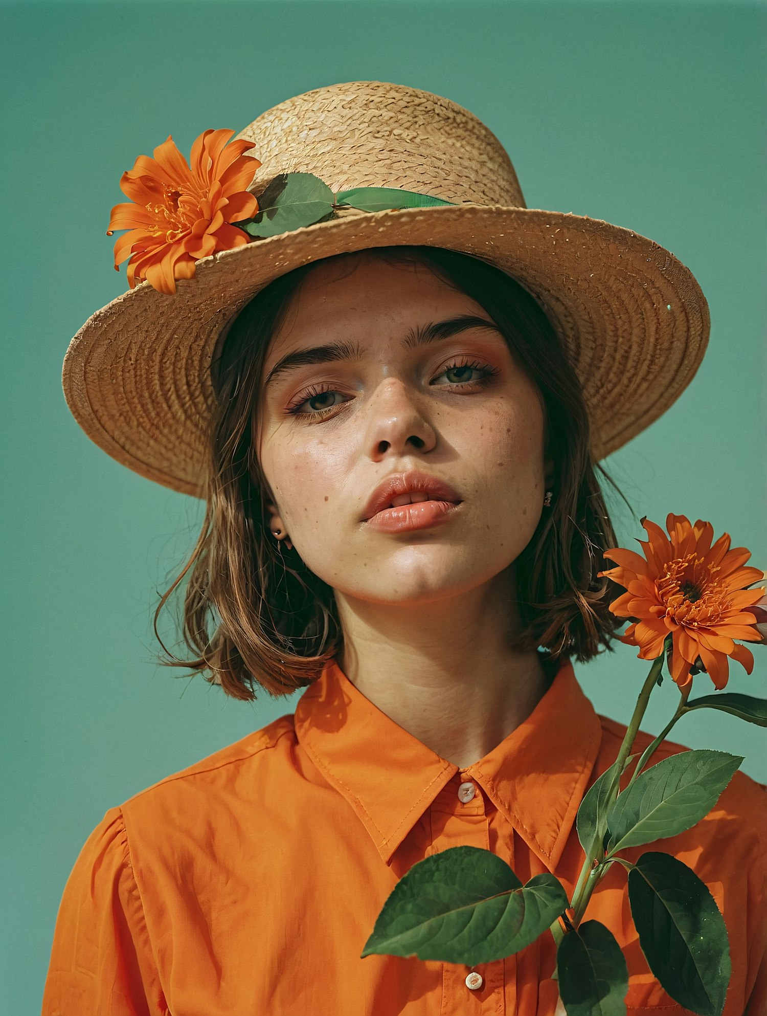 Young woman in straw hat with orange flower, wearing matching orange shirt, against teal background. Calm expression, holding similar flower.