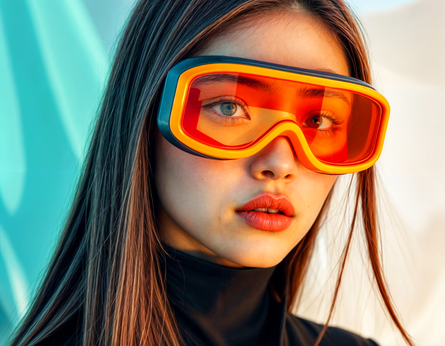Stylish portrait of a young woman wearing vibrant orange goggles against a teal and cream background, exuding a modern, futuristic vibe.