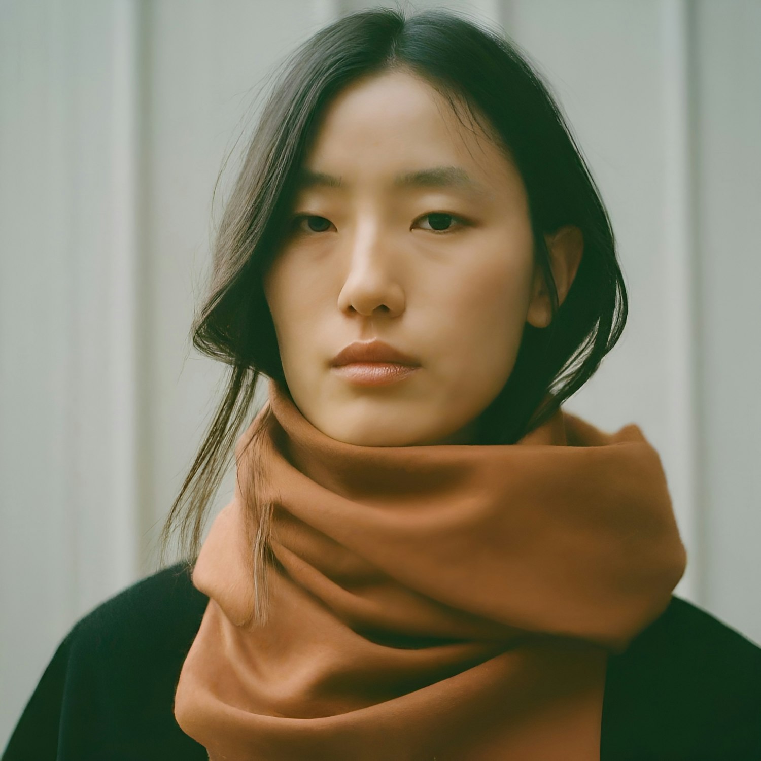 Asian woman with dark hair and a brown scarf, exuding calmness against a neutral background.