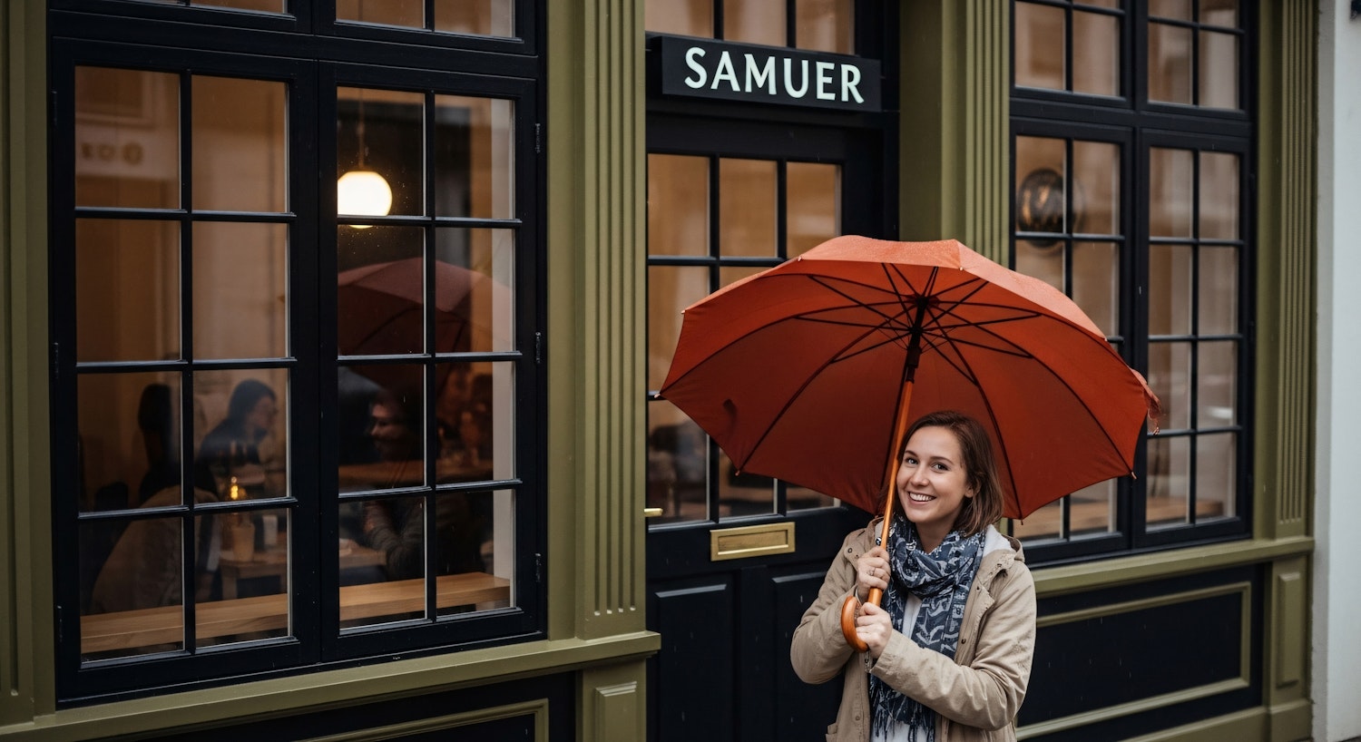 Smiling woman with an orange umbrella outside a stylish storefront on a rainy day, showcasing cozy vibes and urban charm.