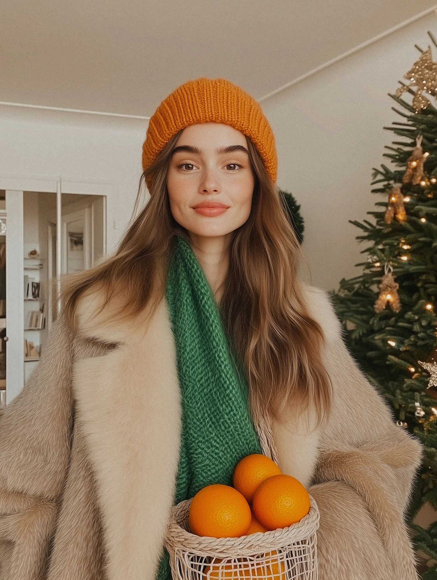 Woman in orange beanie and fur coat holding oranges by a Christmas tree, exuding festive warmth and style.