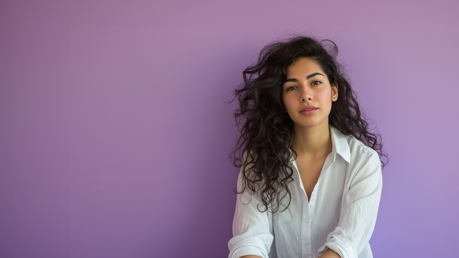 Young woman with curly black hair in a white shirt against a purple background, exuding elegance and confidence.