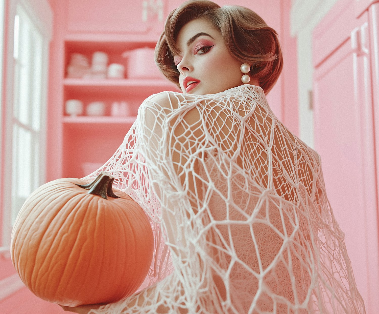 Elegant woman in a pink room holding a pumpkin, wearing a white shawl and pearl earrings, with bold makeup and a vintage vibe.