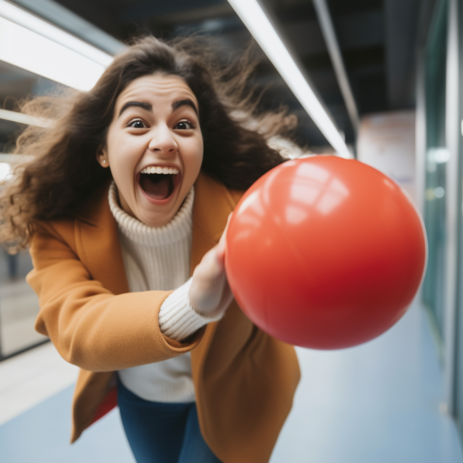 Joyful woman with curly hair and tan coat excitedly holding a red ball in a dynamic indoor setting.