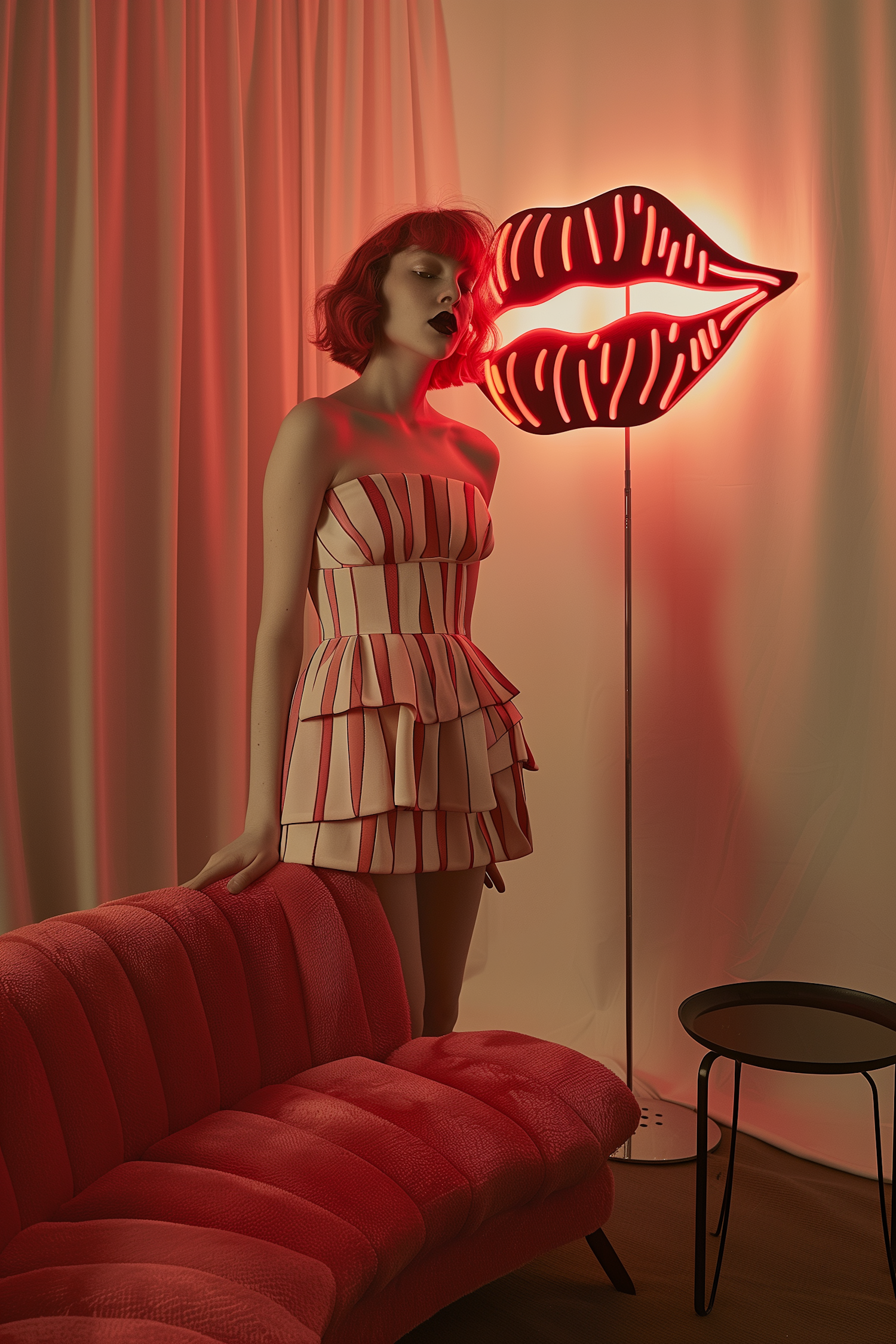 Woman in striped dress with red neon lips light, red sofa, and soft curtains. Bold, dramatic ambiance with warm lighting.
