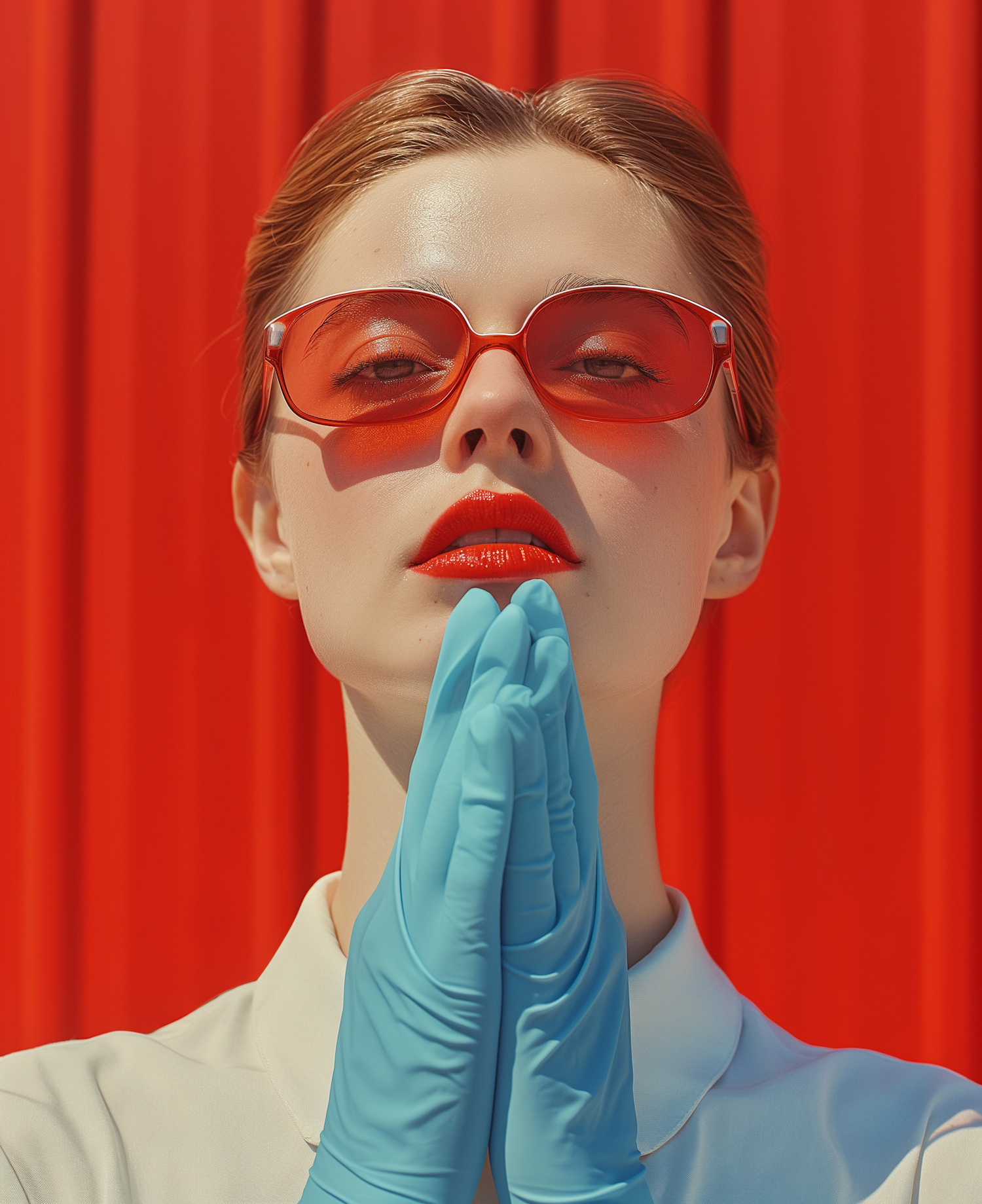 Stylish woman in red sunglasses and blue gloves against a bold red backdrop, exuding modern elegance and contrast.