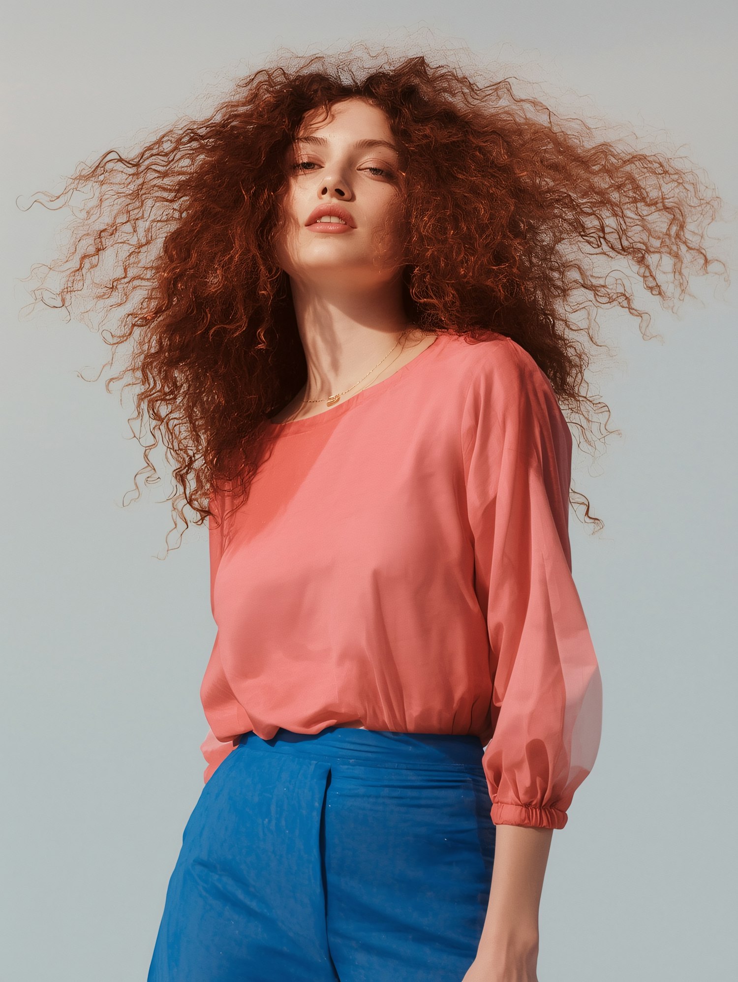 A stylish woman with curly red hair in a coral blouse and blue trousers, posing against a light background with a confident expression.