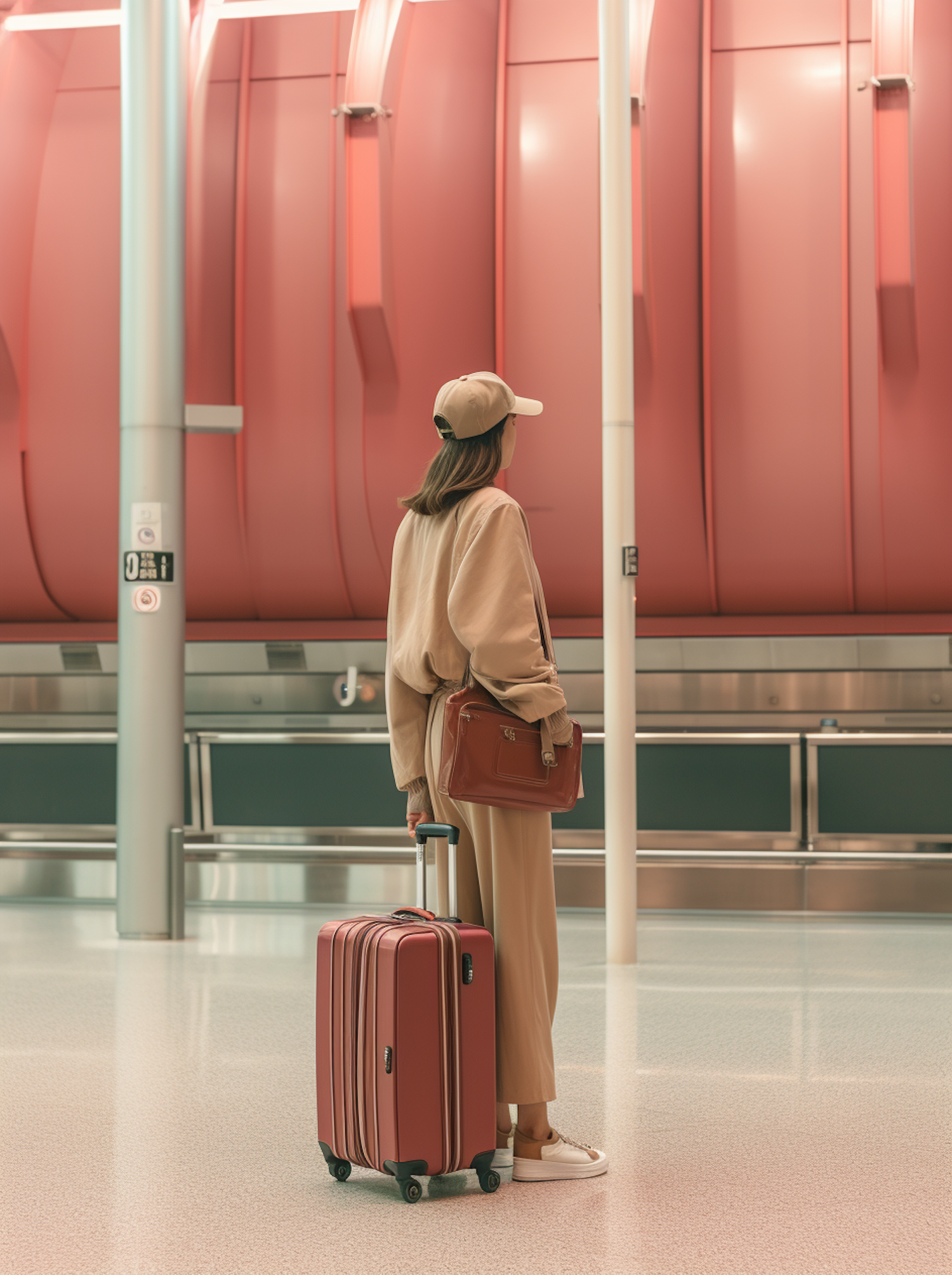 Woman in beige tracksuit with pink suitcase at modern airport terminal, red panels in background.
