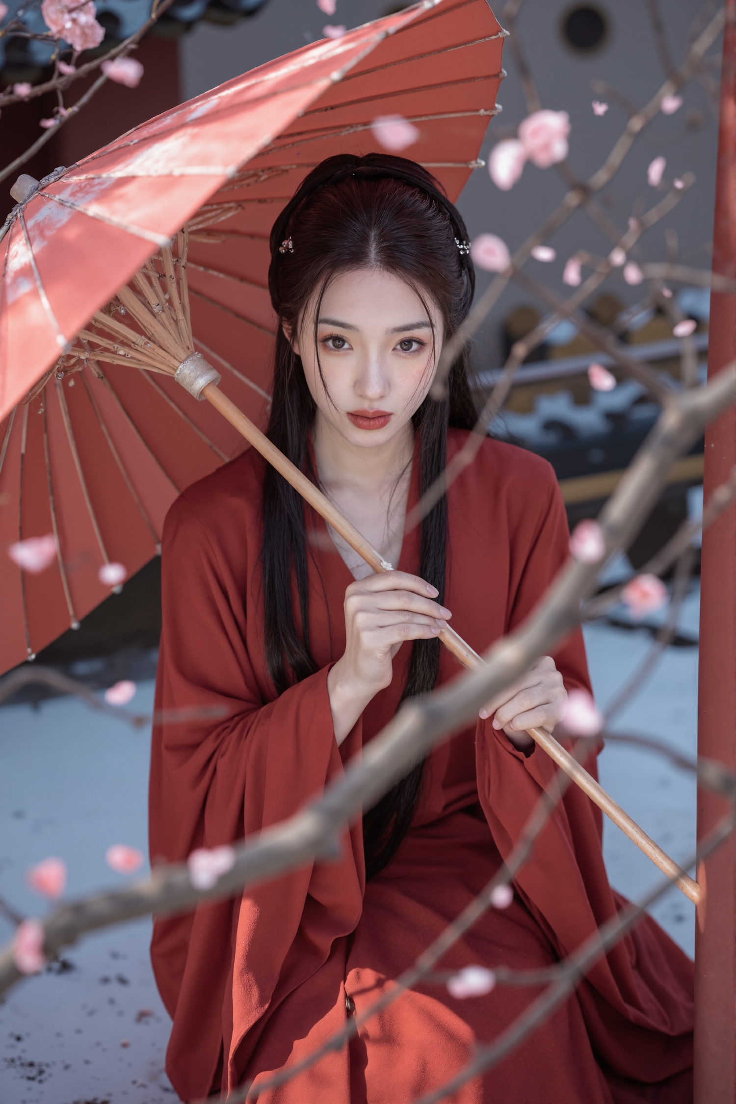 A serene portrait of a woman in red traditional attire holding a parasol, framed by cherry blossoms, exuding elegance and cultural charm.