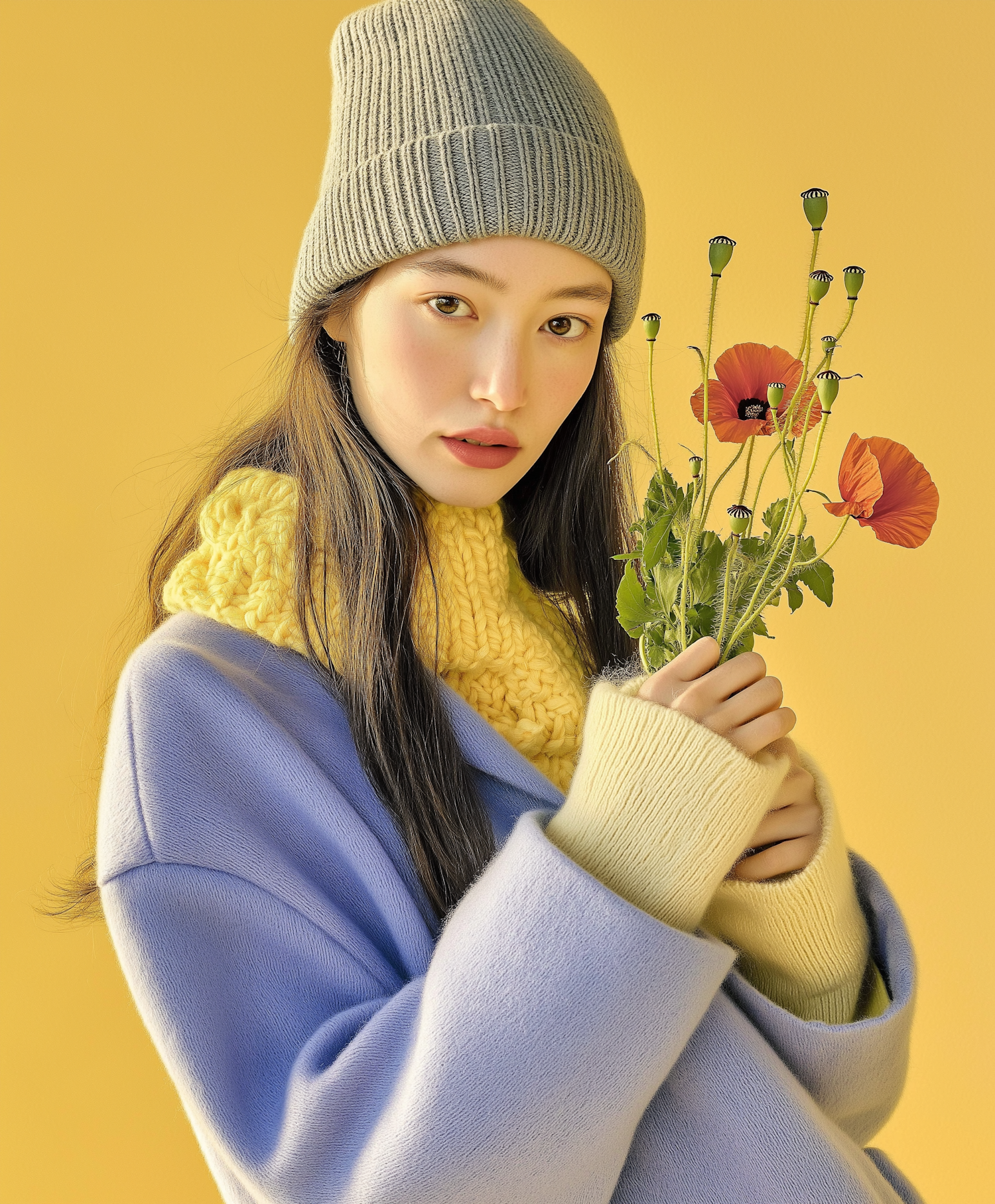 A stylish woman in a blue coat and yellow scarf holds red poppies against a vibrant yellow background, blending warmth and elegance.