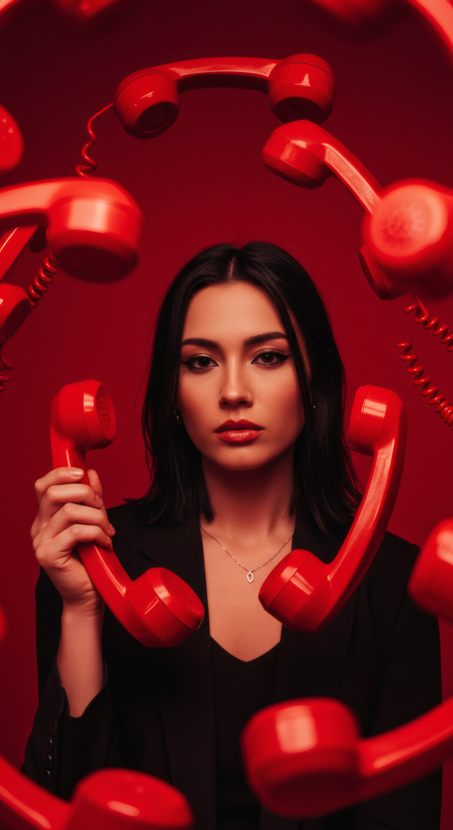 Woman with dark hair holding a red phone, surrounded by floating red receivers against a vibrant red background.