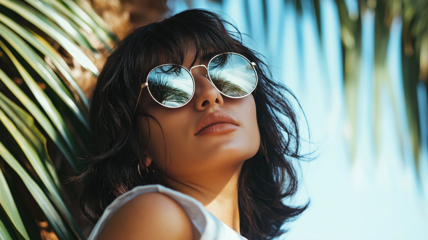 Stylish woman with reflective sunglasses and tropical vibes, framed by palm leaves and a sunny blue sky.
