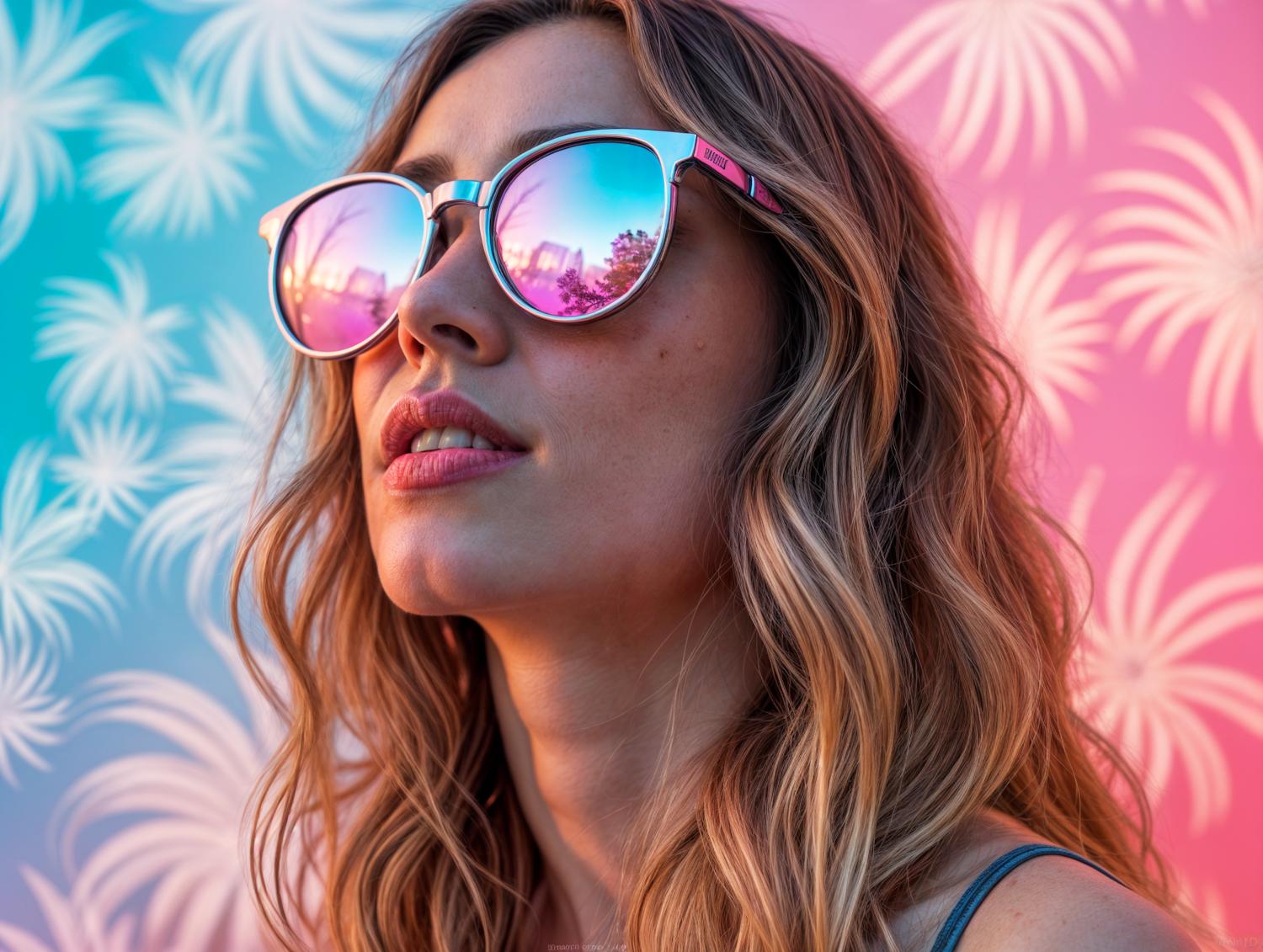 Young woman with wavy hair and reflective sunglasses against a pink and blue tropical background, exuding a summery vibe.