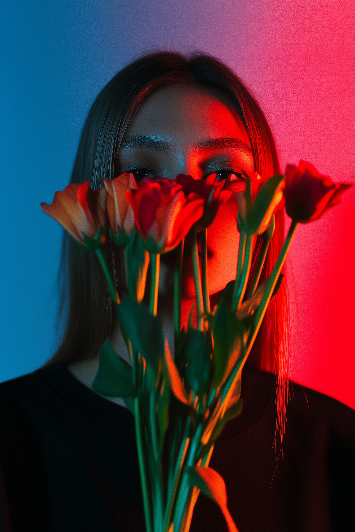 A striking portrait of a woman holding vibrant roses, illuminated by dramatic red and blue lighting for a bold, artistic effect.
