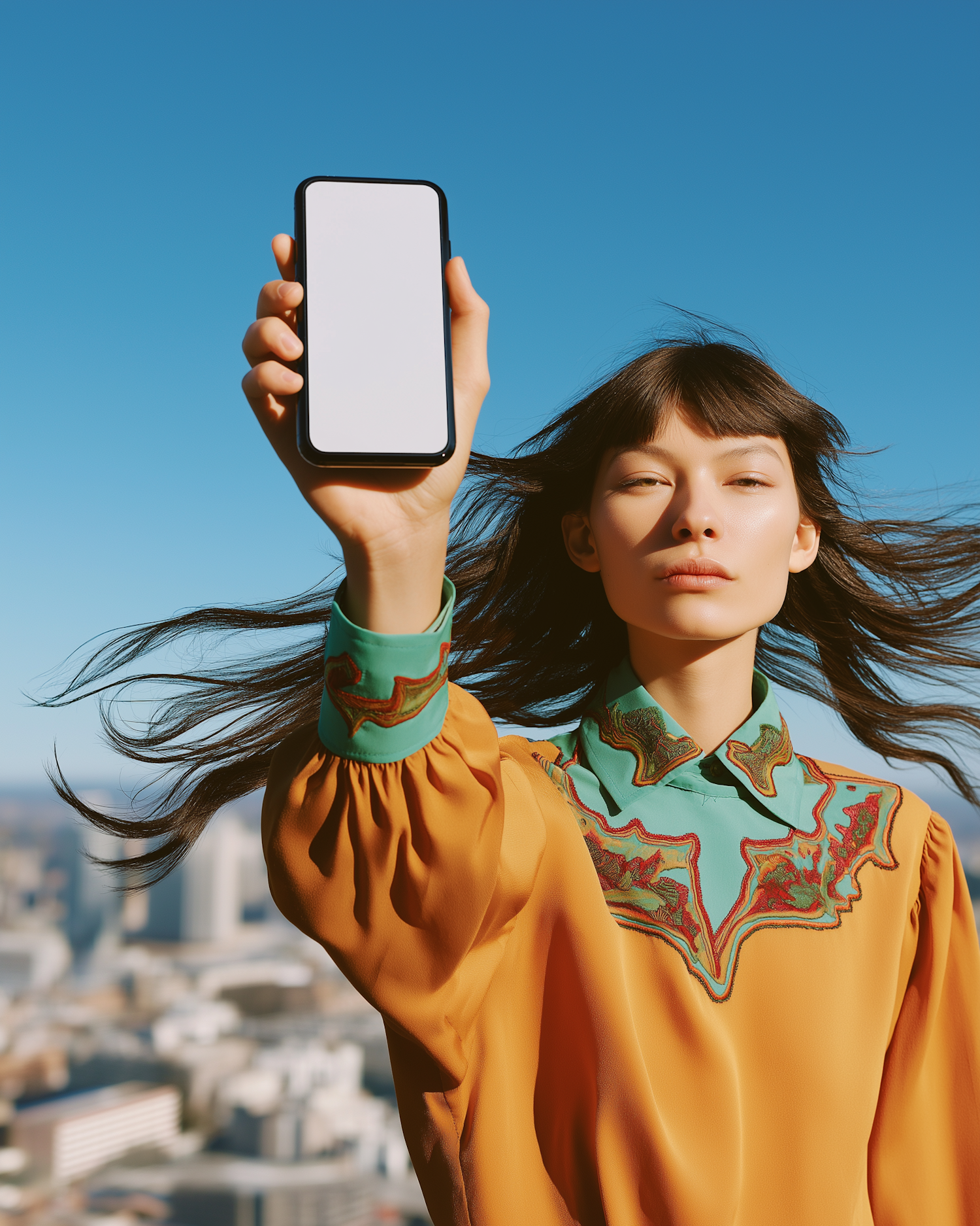 Stylish woman in orange blouse holding a blank smartphone screen against a clear blue sky with a cityscape in the background.