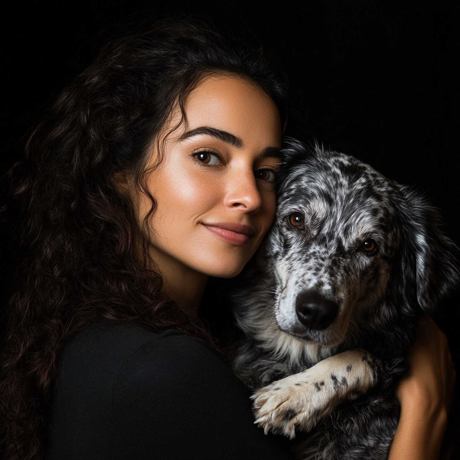 A woman with curly dark hair lovingly embraces a speckled dog against a dark background, highlighting their bond.