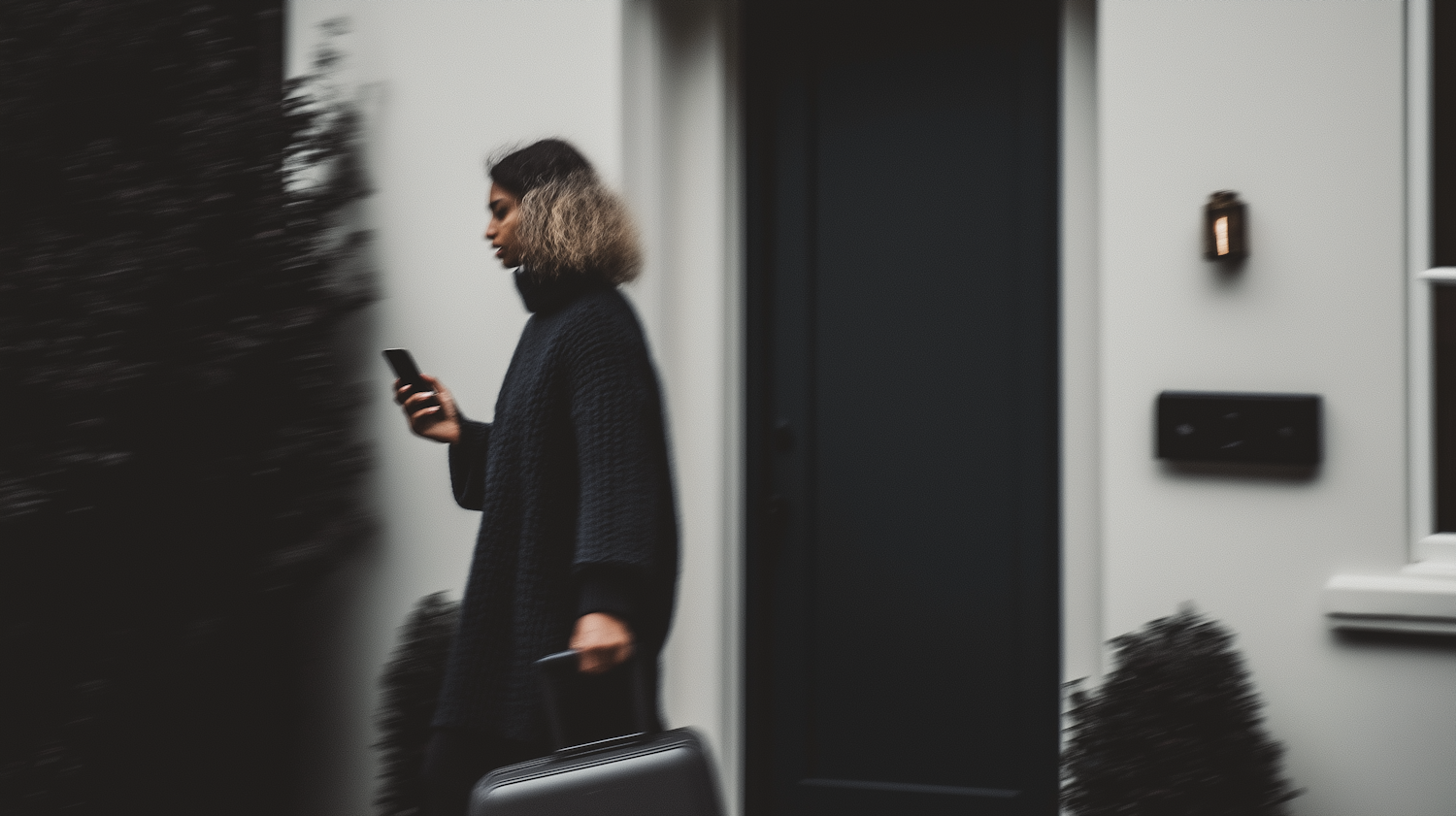 A woman with a suitcase and phone walks past a modern house with a black door and white walls, creating a sleek and minimalistic vibe.