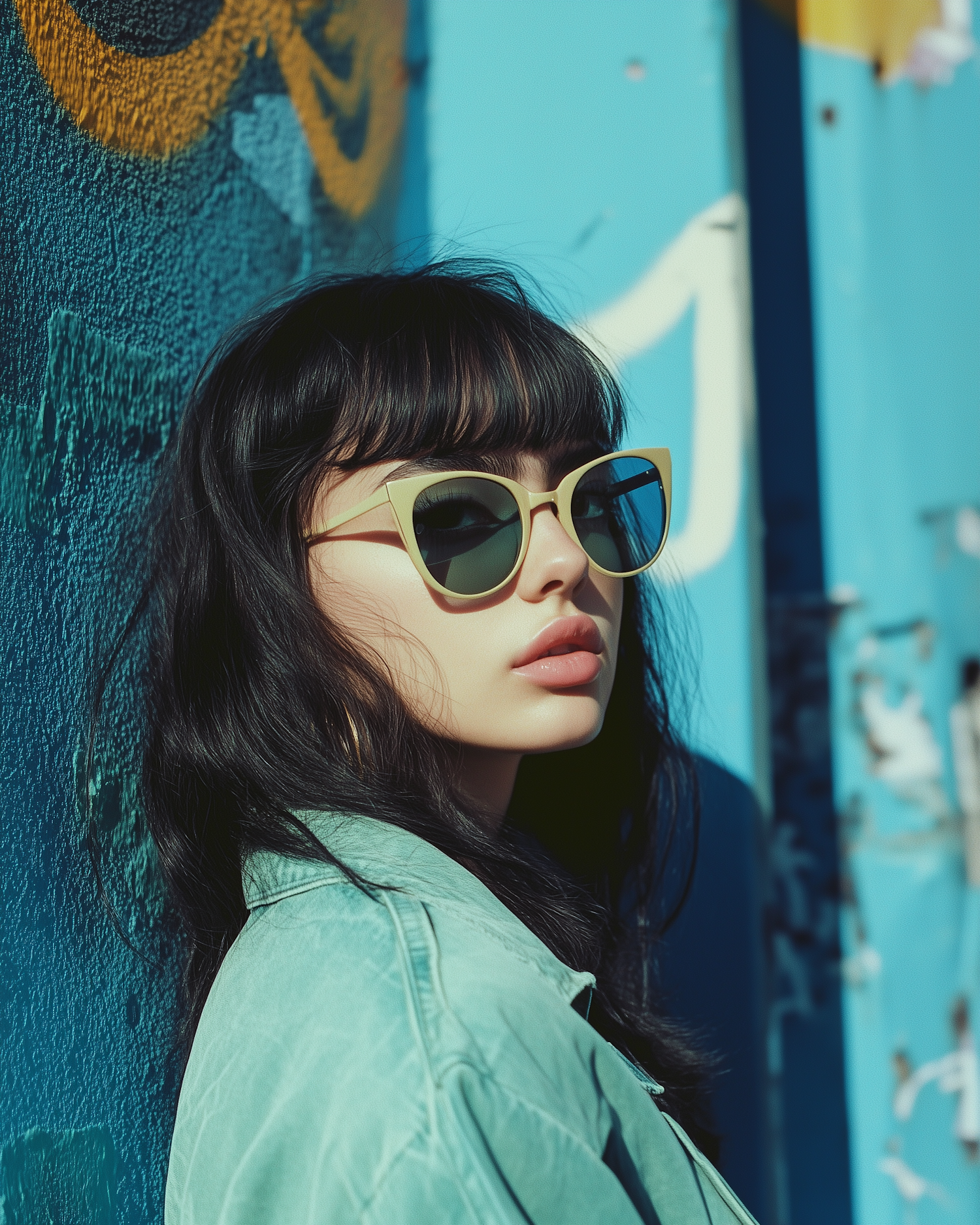 Stylish woman with sunglasses against a vibrant graffiti wall, exuding confidence and modern urban flair.