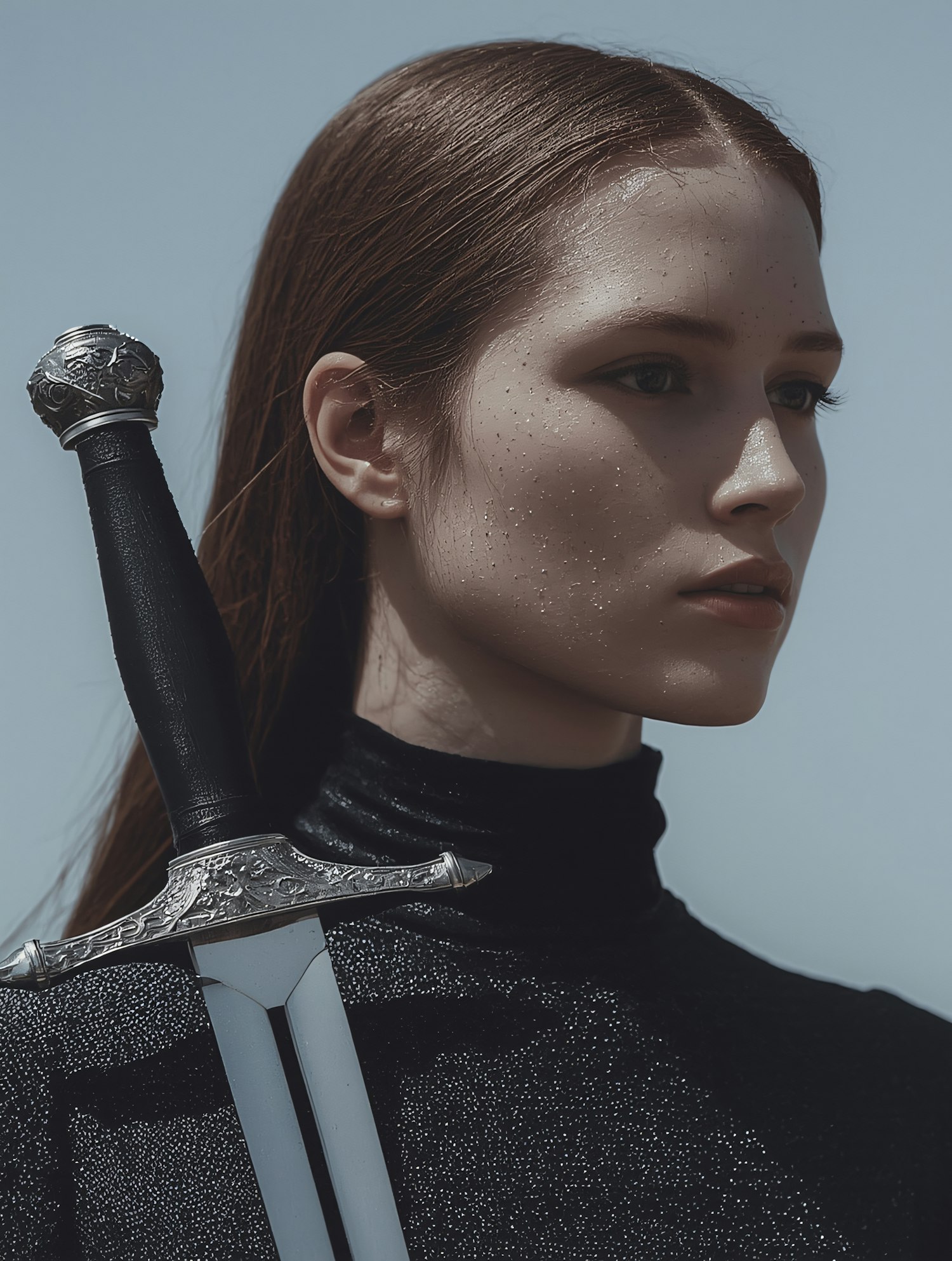 Close-up of a woman holding a decorative sword, wearing a black outfit, with water droplets on her face against a clear blue sky.