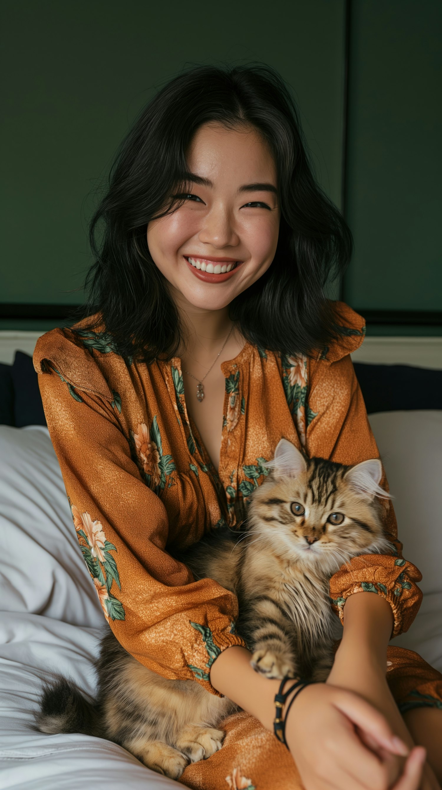 Smiling woman in a floral orange dress holding a fluffy tabby cat, set against a soft green background.
