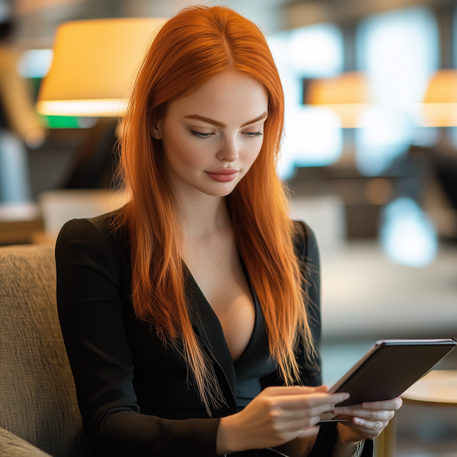 Red-haired woman in black outfit using a tablet in a cozy, warmly lit indoor setting.