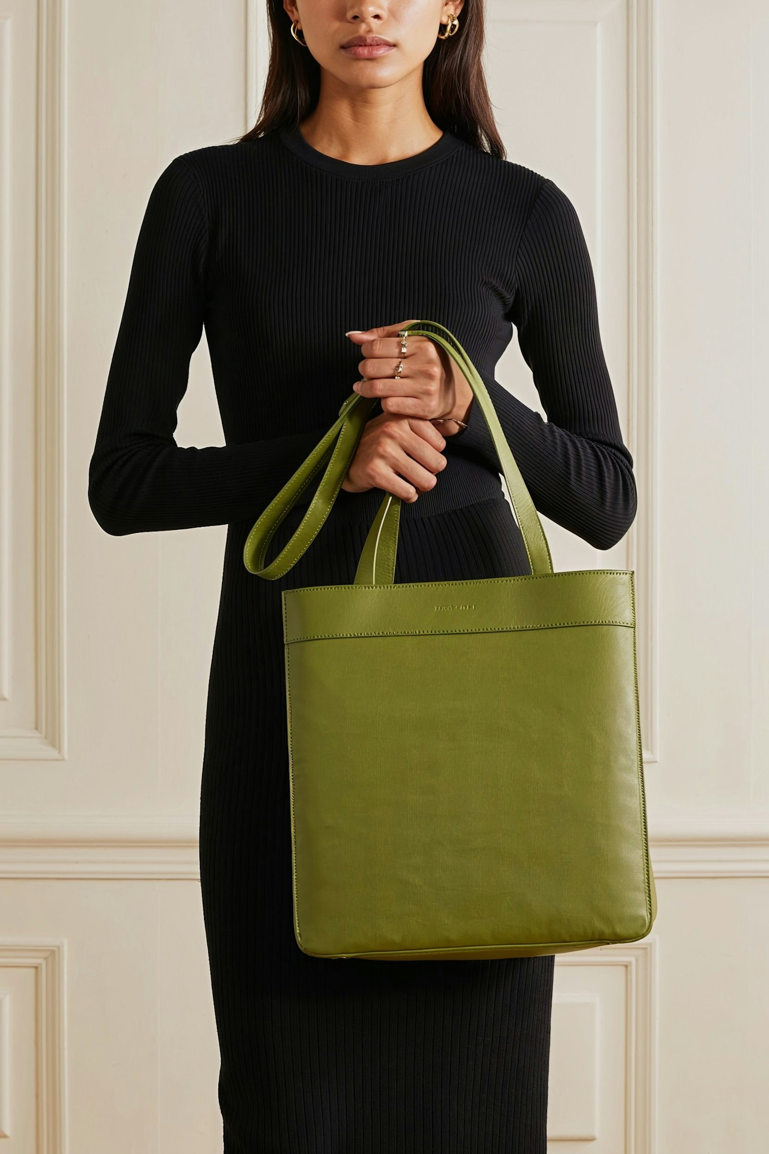 Stylish woman in a black ribbed dress holding a sleek olive-green leather tote bag, accessorized with gold jewelry in an elegant setting.