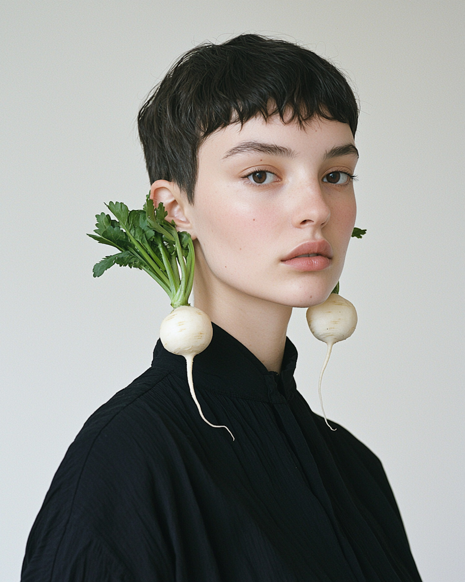 Minimalist portrait of a woman with turnip earrings, short dark hair, and a black outfit against a plain light background.