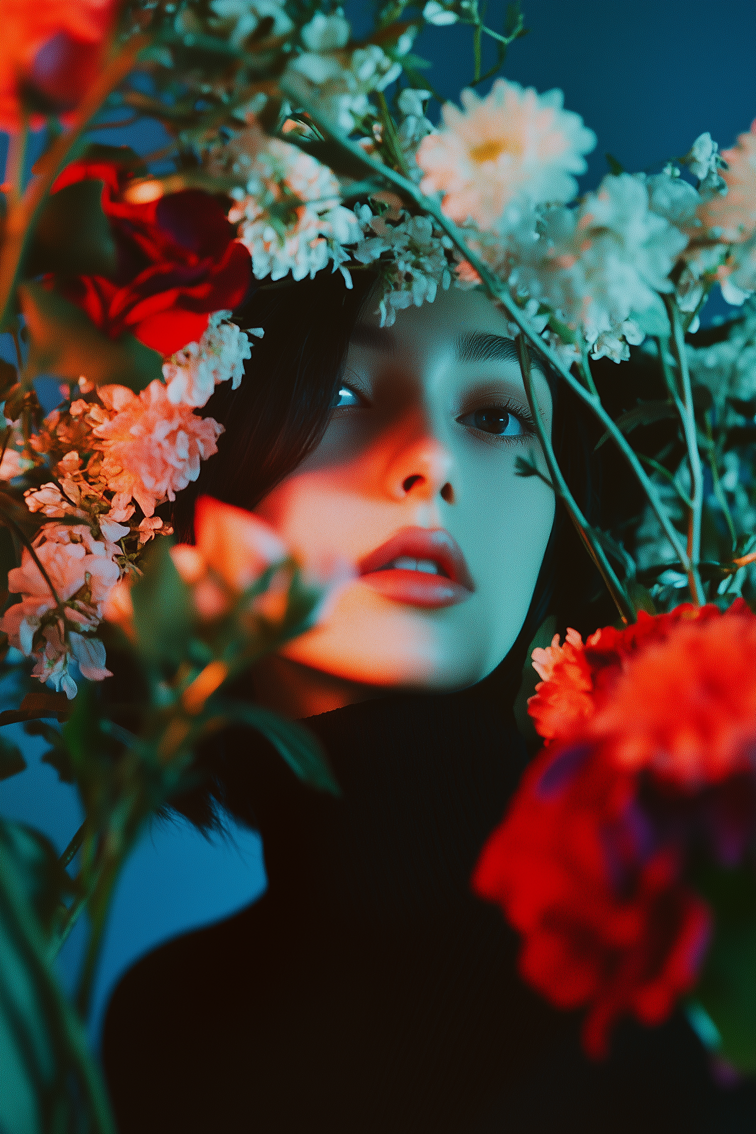Artistic portrait of a woman framed by vibrant flowers, with dramatic red and blue lighting creating a surreal, dreamlike atmosphere.
