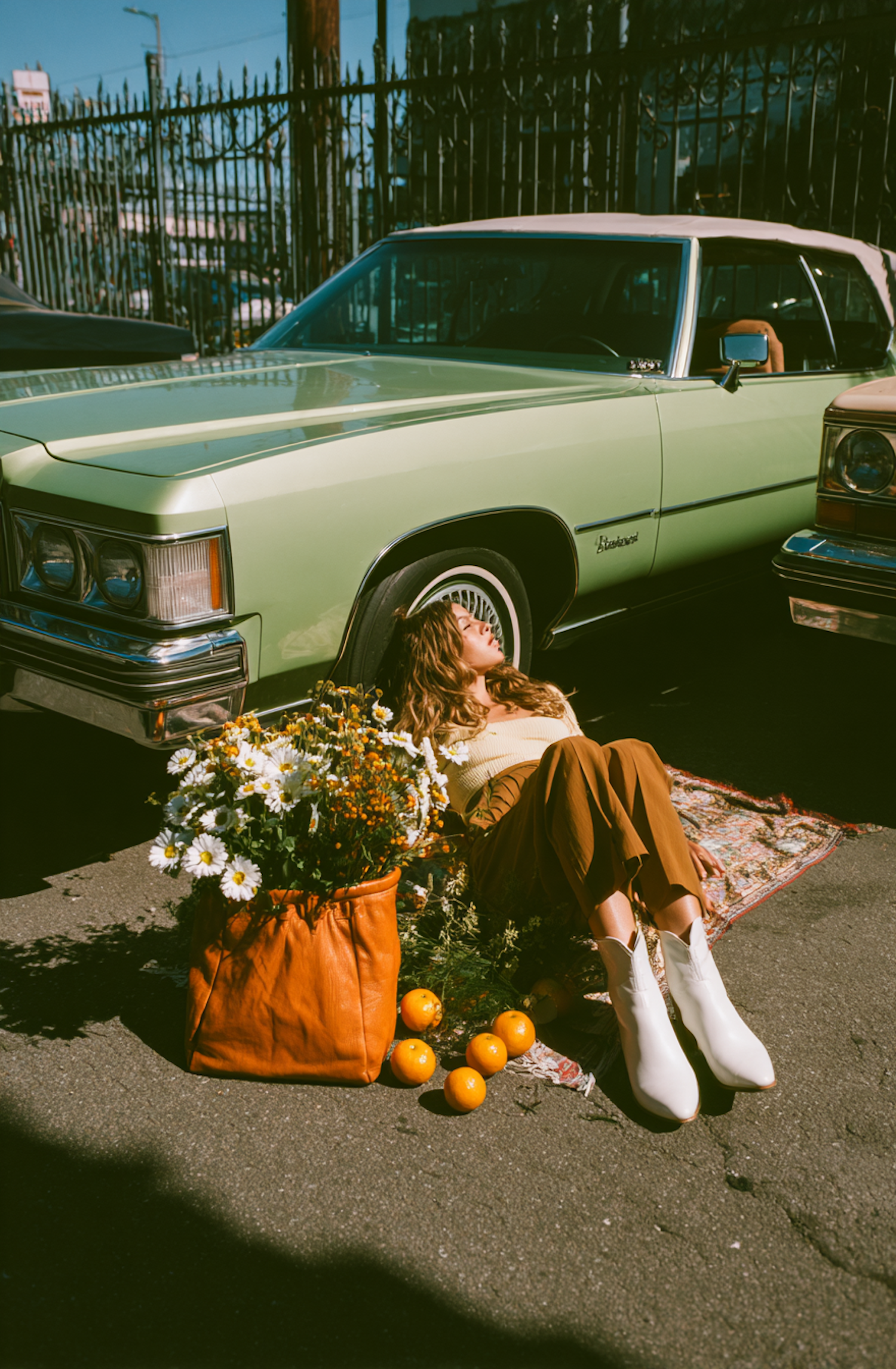 A woman relaxes by a vintage green car with flowers and oranges, creating a nostalgic and sunny outdoor vibe.