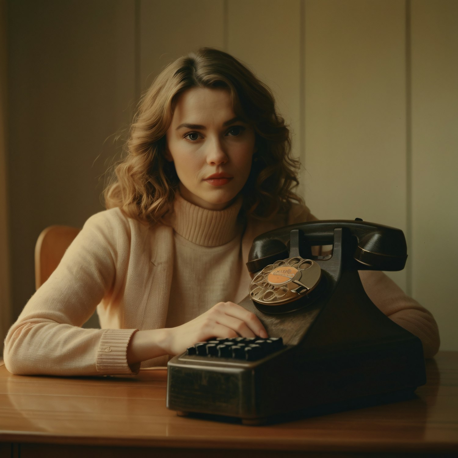 A young woman with light brown hair and a vintage outfit sits by a black rotary phone, evoking a nostalgic and retro atmosphere.
