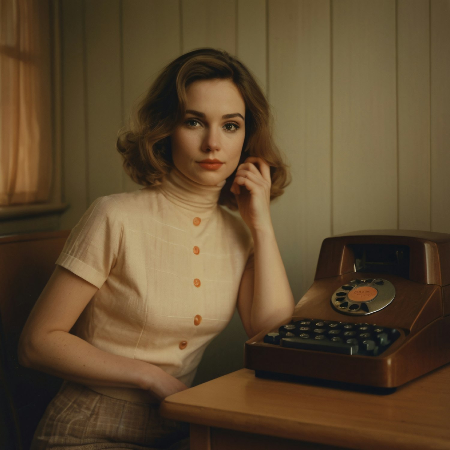 A young woman in a vintage beige blouse sits by a retro rotary phone, evoking a nostalgic and warm mid-century aesthetic.