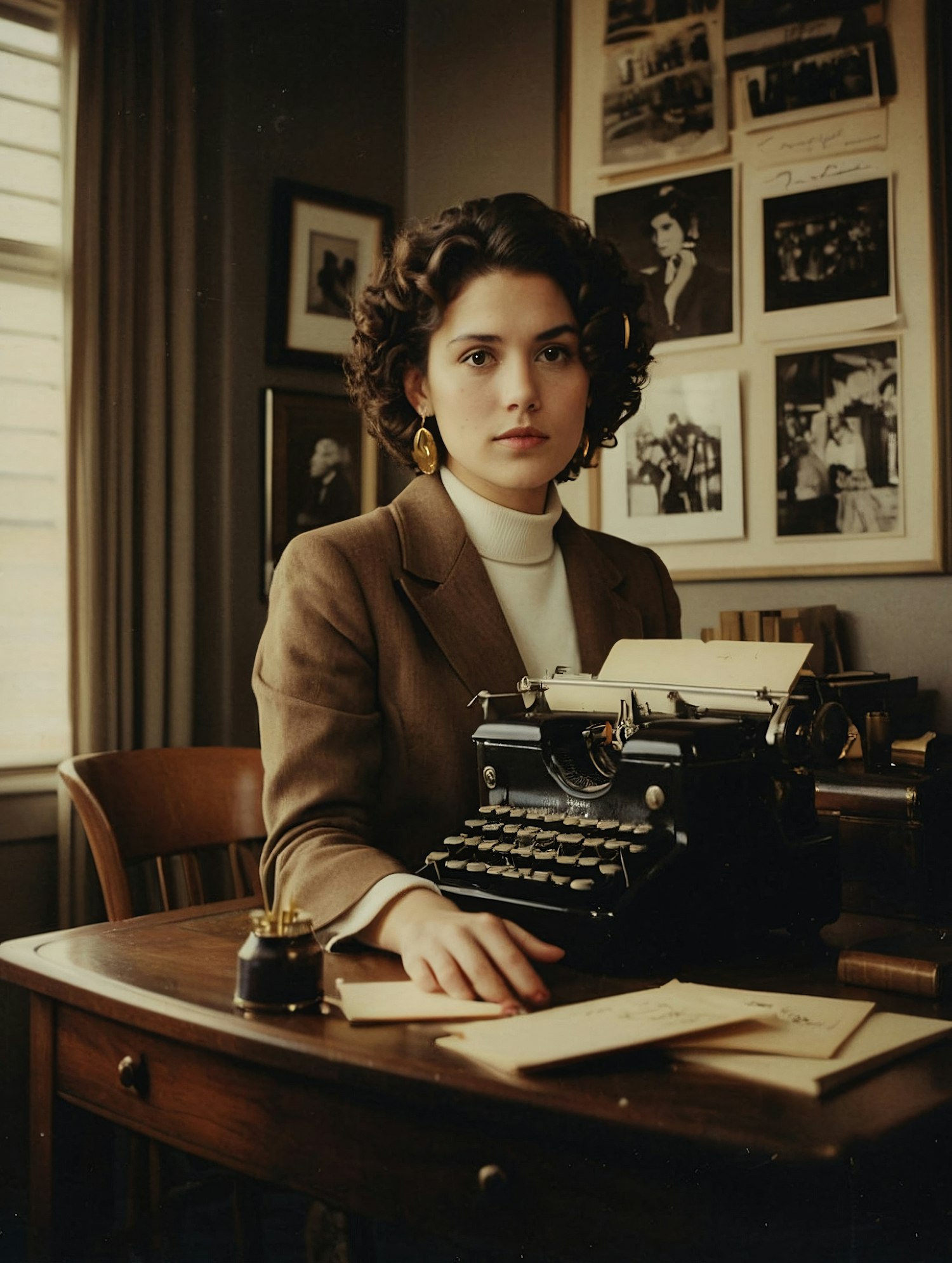 Young woman with curly hair at a desk with a vintage typewriter, surrounded by framed photos, exuding a nostalgic, historical vibe.