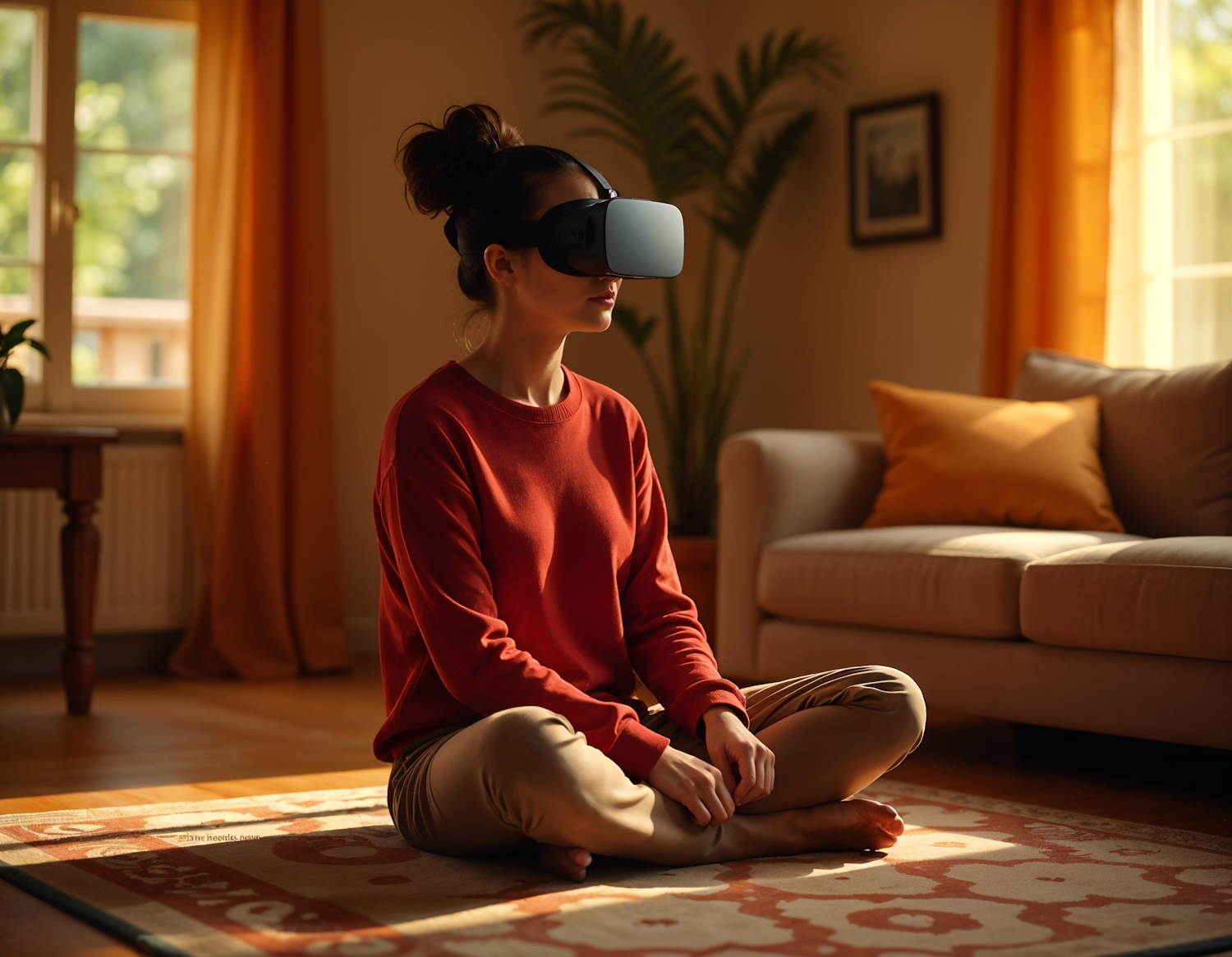 Woman in red sweater using VR headset in sunlit living room, sitting cross-legged on a patterned rug. Cozy and immersive setting.