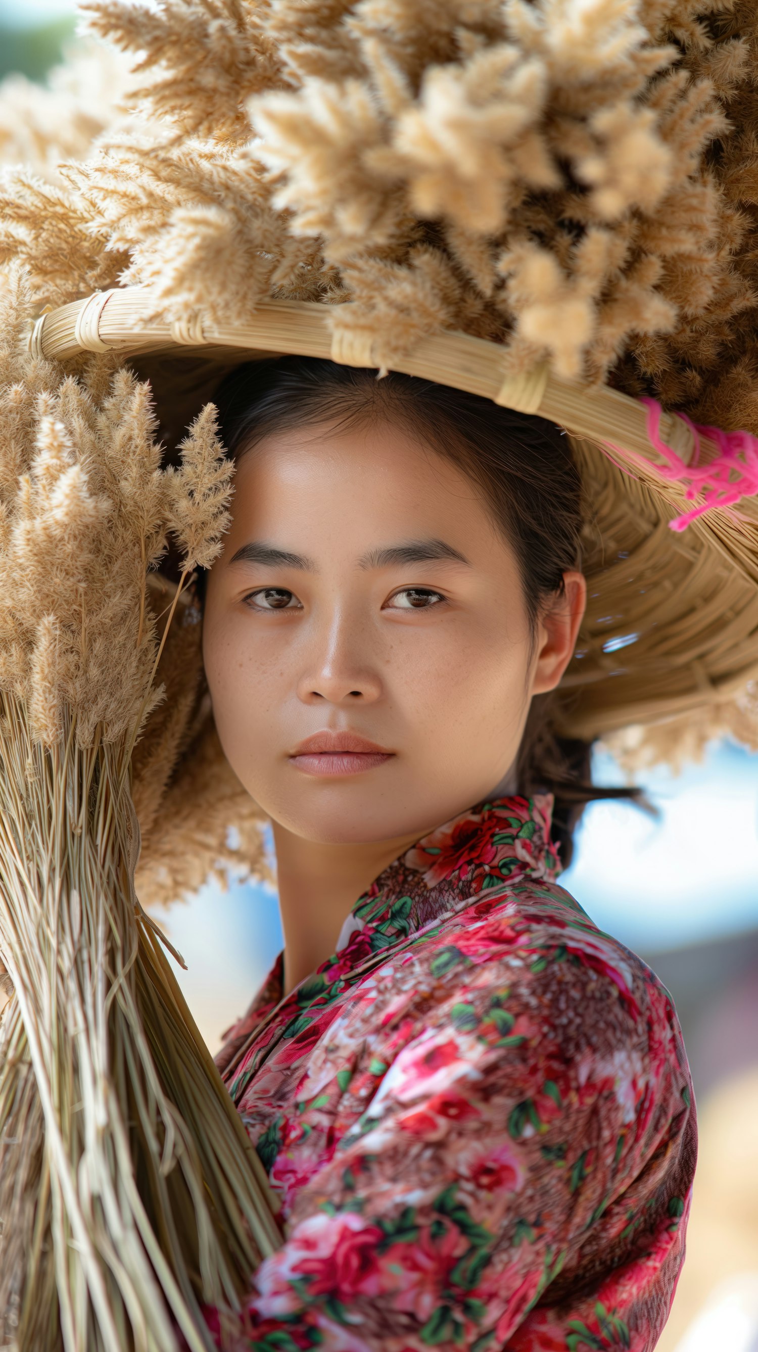 Asian woman in floral attire with a woven hat filled with wheat, gazing calmly. Earthy tones and serene expression highlight the portrait.
