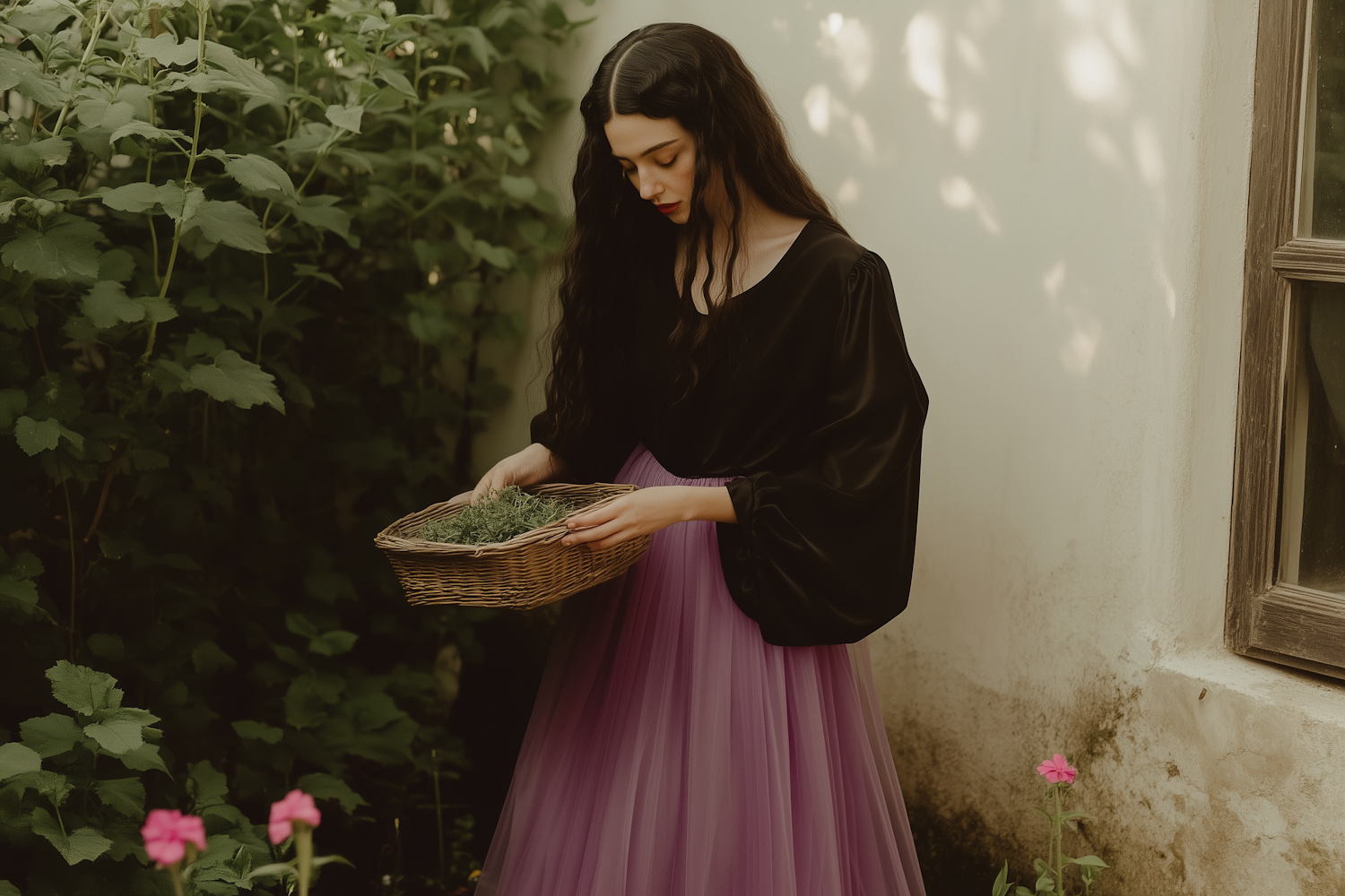 A serene woman in a garden holds a basket of herbs, wearing a black blouse and purple skirt, surrounded by lush greenery and pink flowers.
