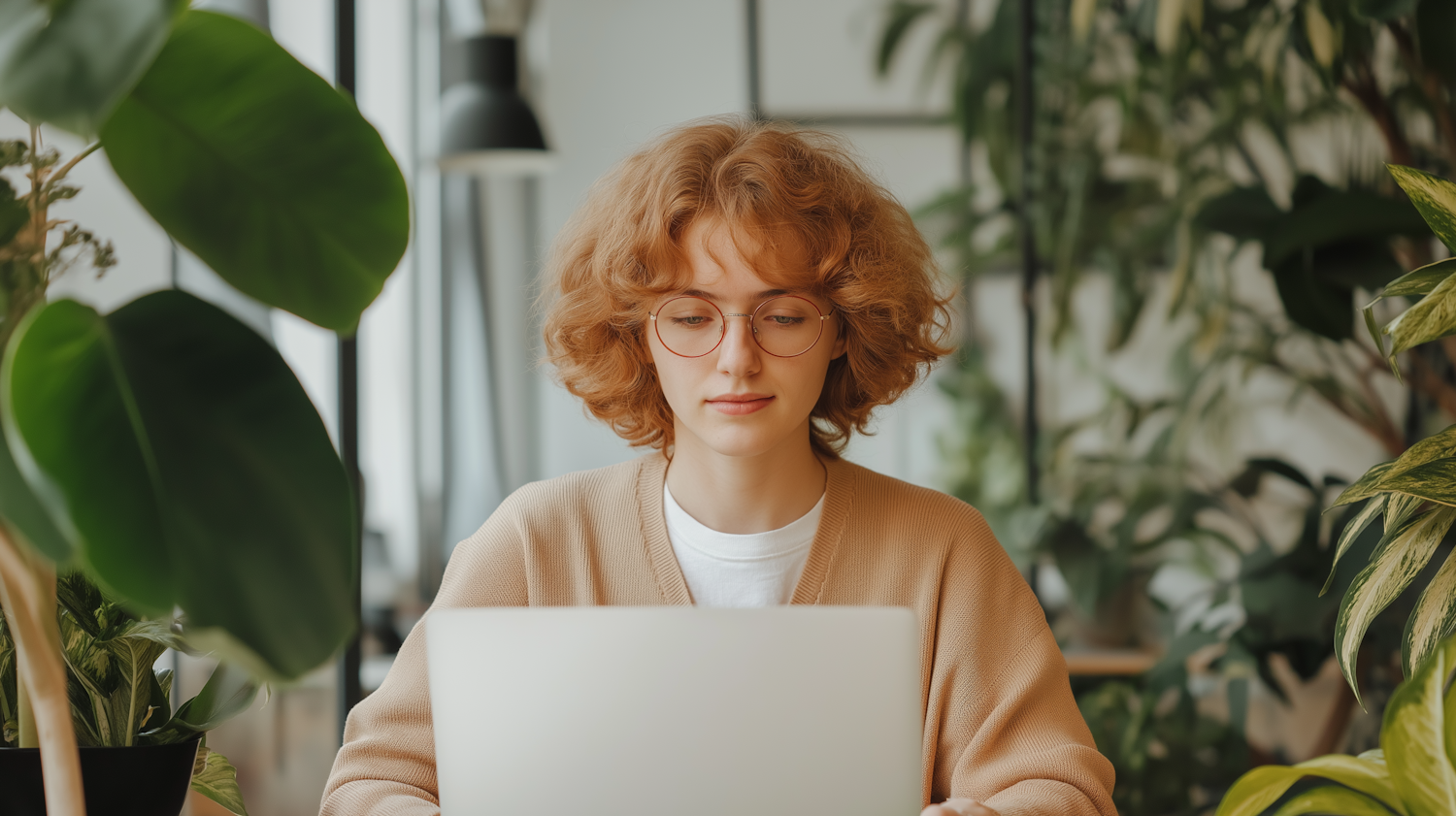 Young woman with curly red hair and glasses working on a laptop in a plant-filled, cozy workspace with natural lighting.