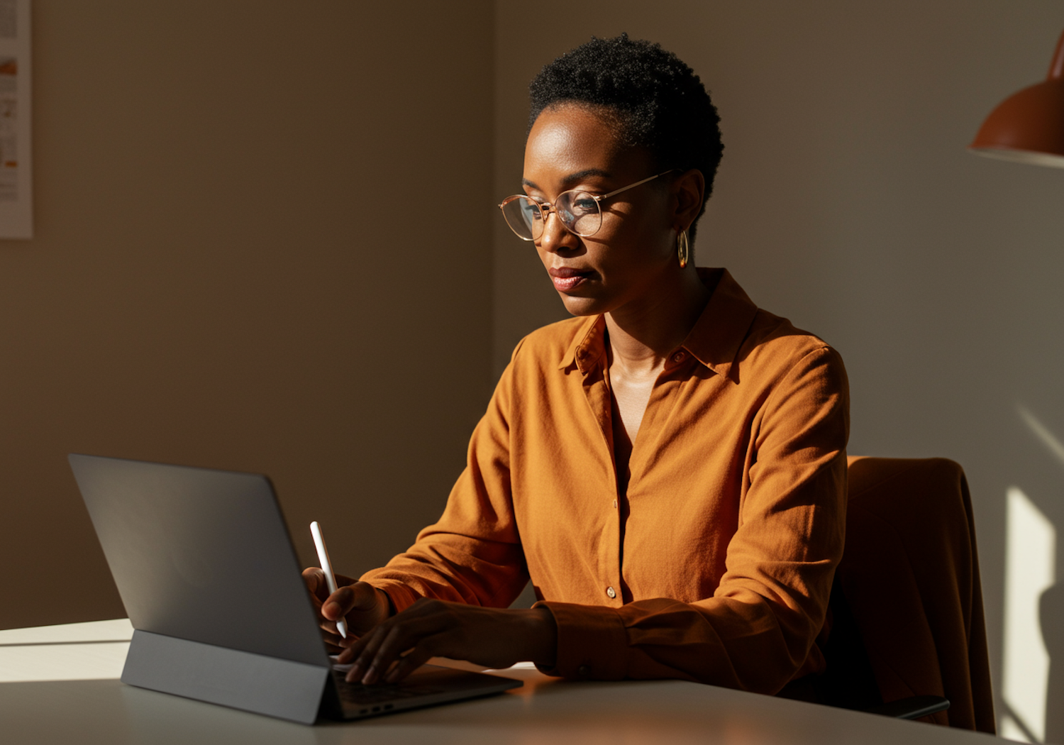 Focused woman in an orange shirt working on a laptop with a stylus in a warmly lit workspace.