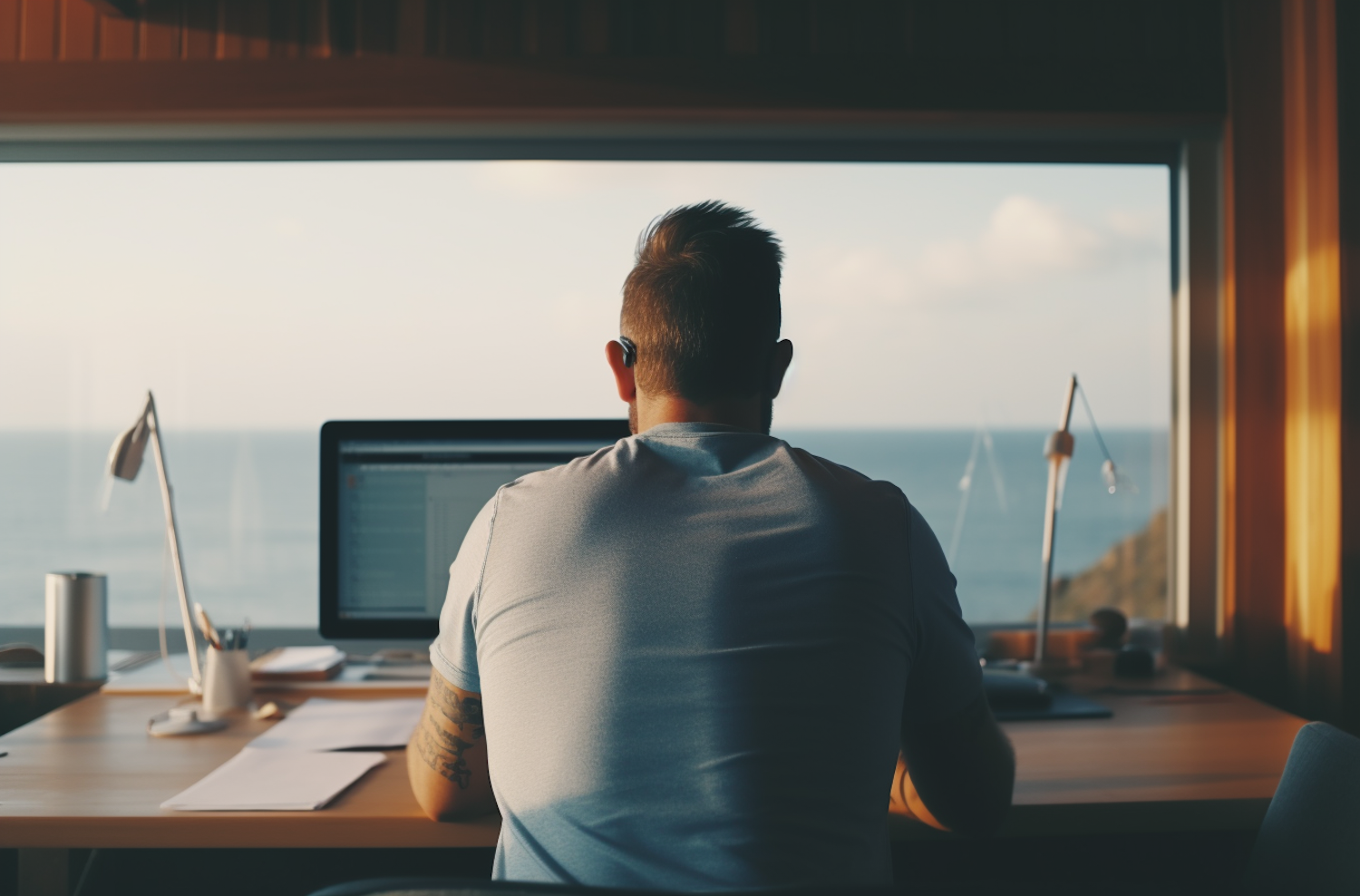 Man working at a desk with an ocean view, wearing a light blue shirt, surrounded by office supplies in a warmly lit room.