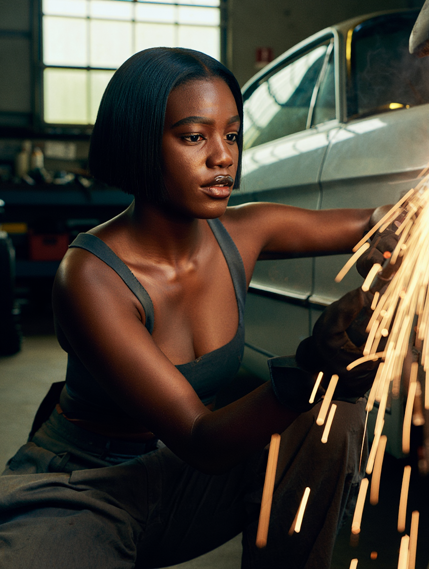 A woman in a workshop using a tool that emits sparks, showcasing her focus and skill in a mechanical setting.