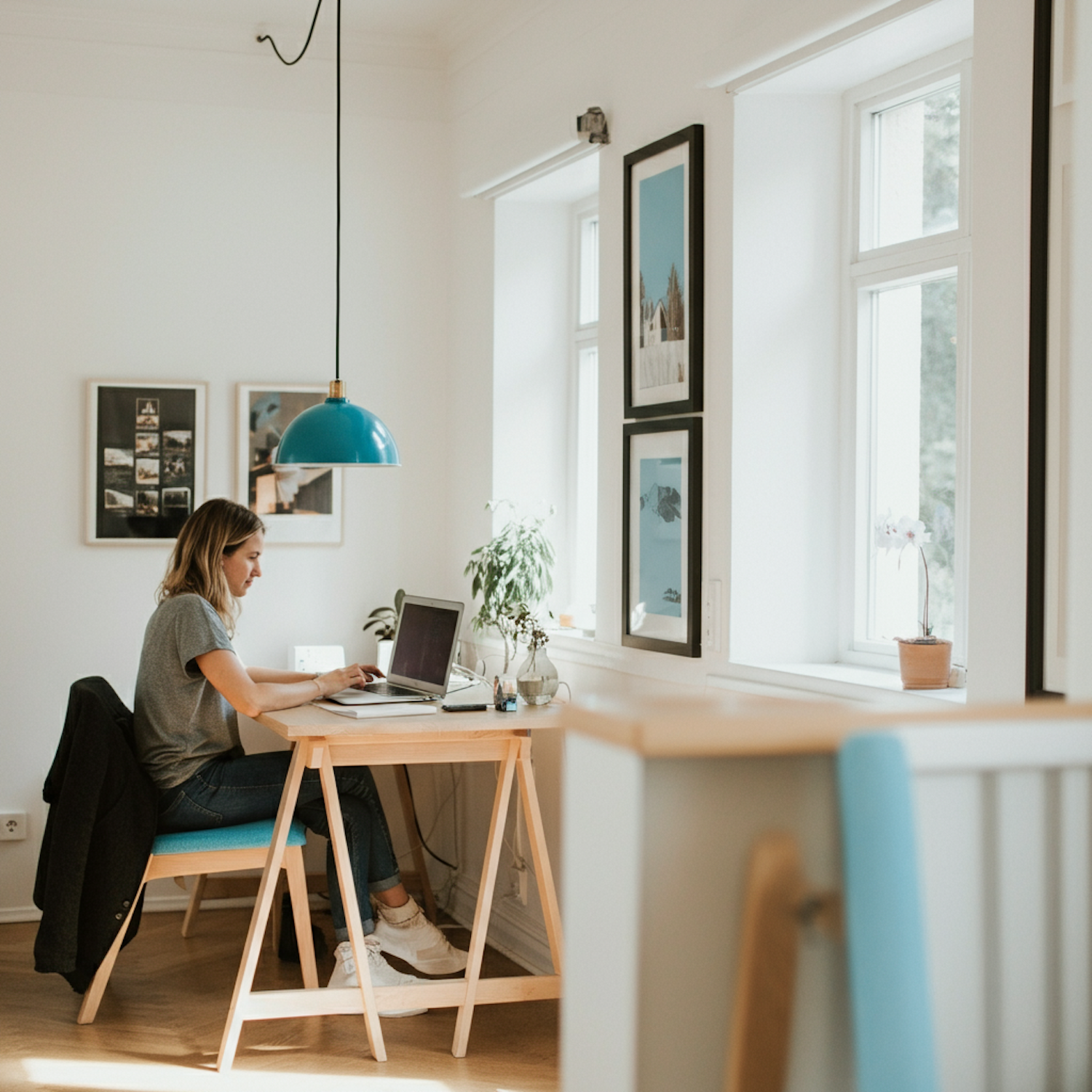 Woman working on a laptop at a wooden desk in a bright room with framed art and a blue pendant lamp.