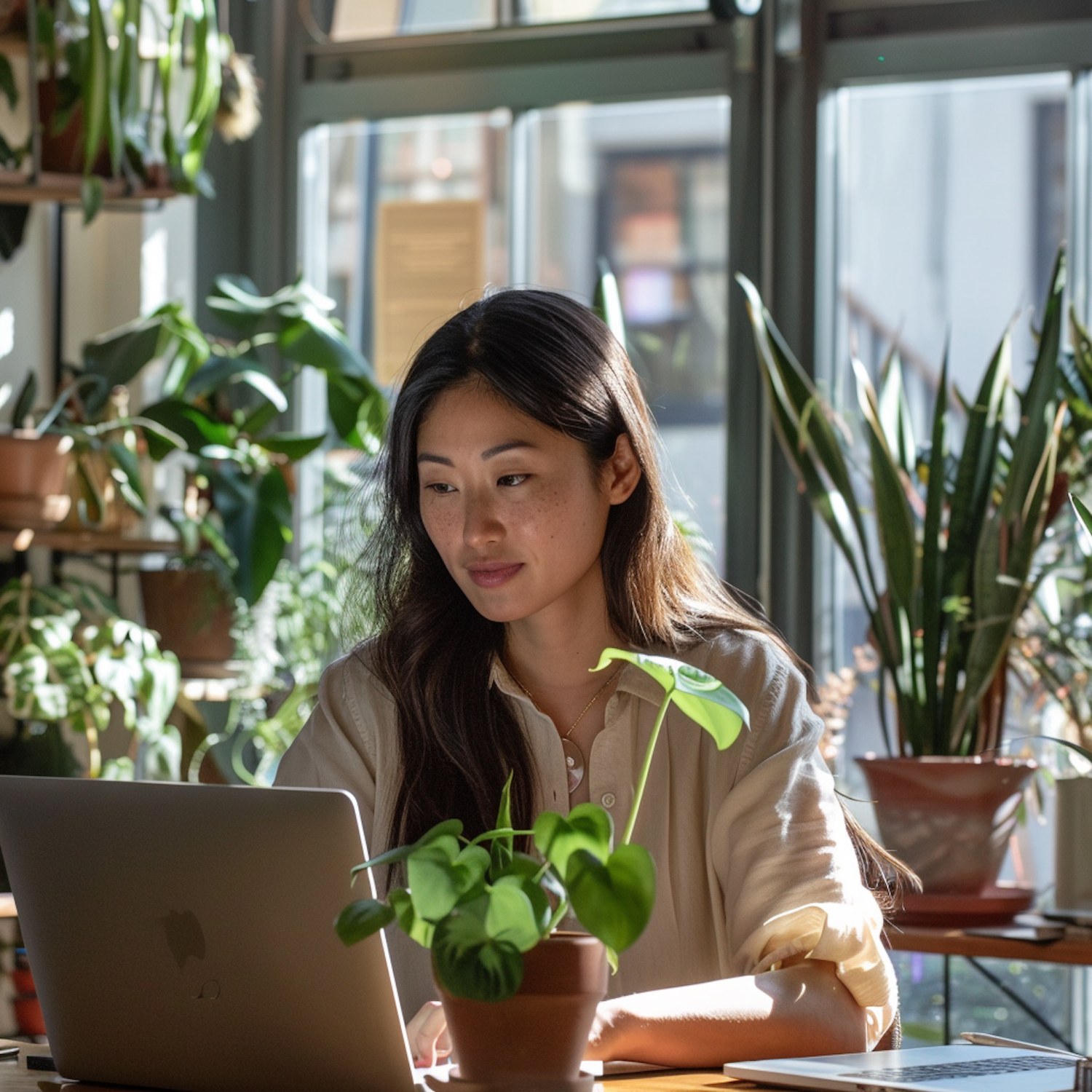 A young woman working on a laptop in a sunlit room filled with lush green plants, creating a calm and productive vibe.
