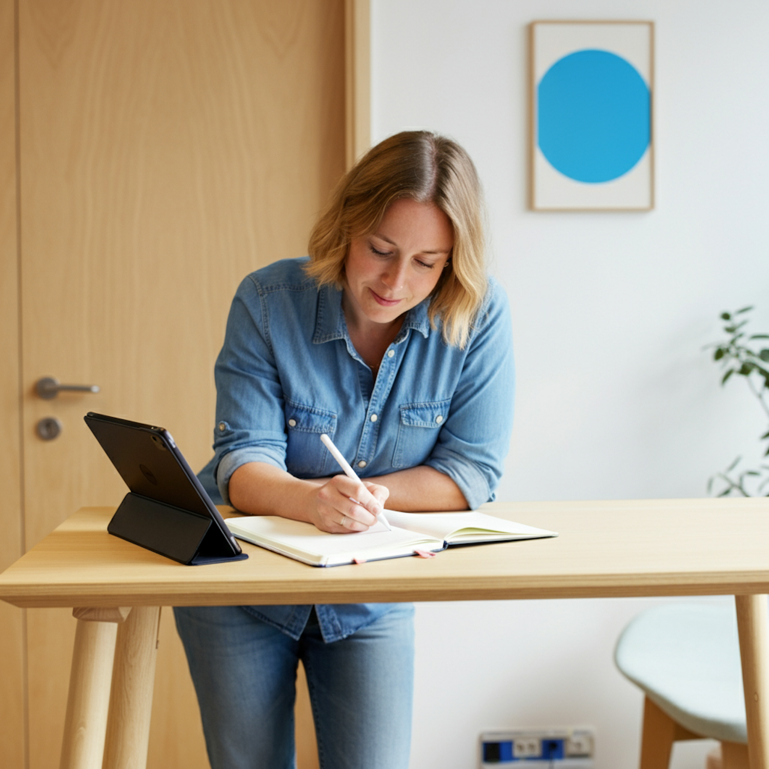 Woman in denim writes in a notebook at a wooden desk with a tablet nearby, in a modern workspace with minimalist decor.